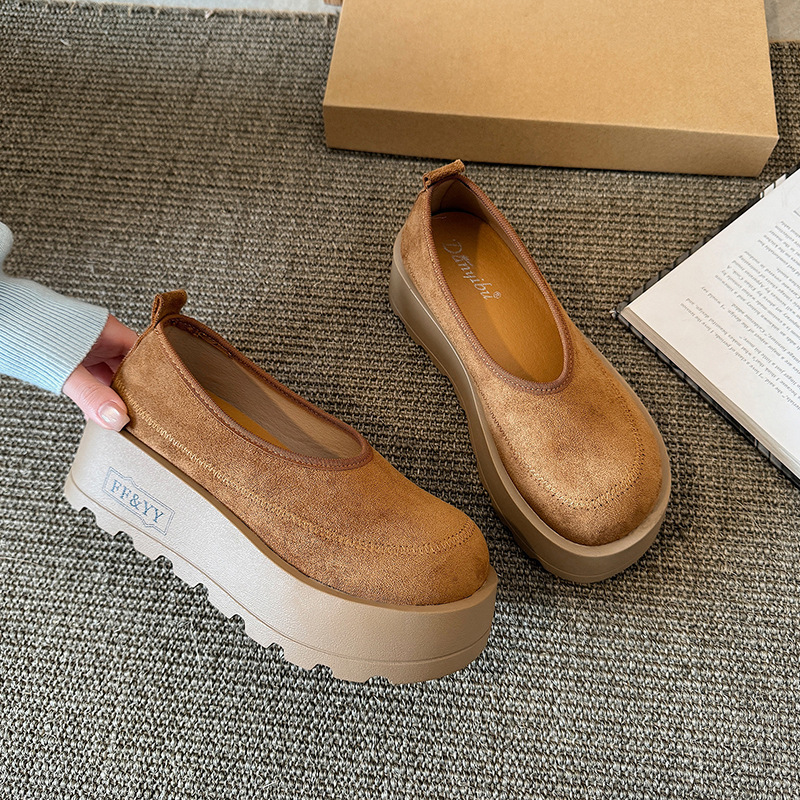 여성을위한 레트로 스웨이드 두꺼운 밑창 플랫폼 신발 2025 새로운 인형 머리 슬립 온 신발 다목적 캐주얼 신발