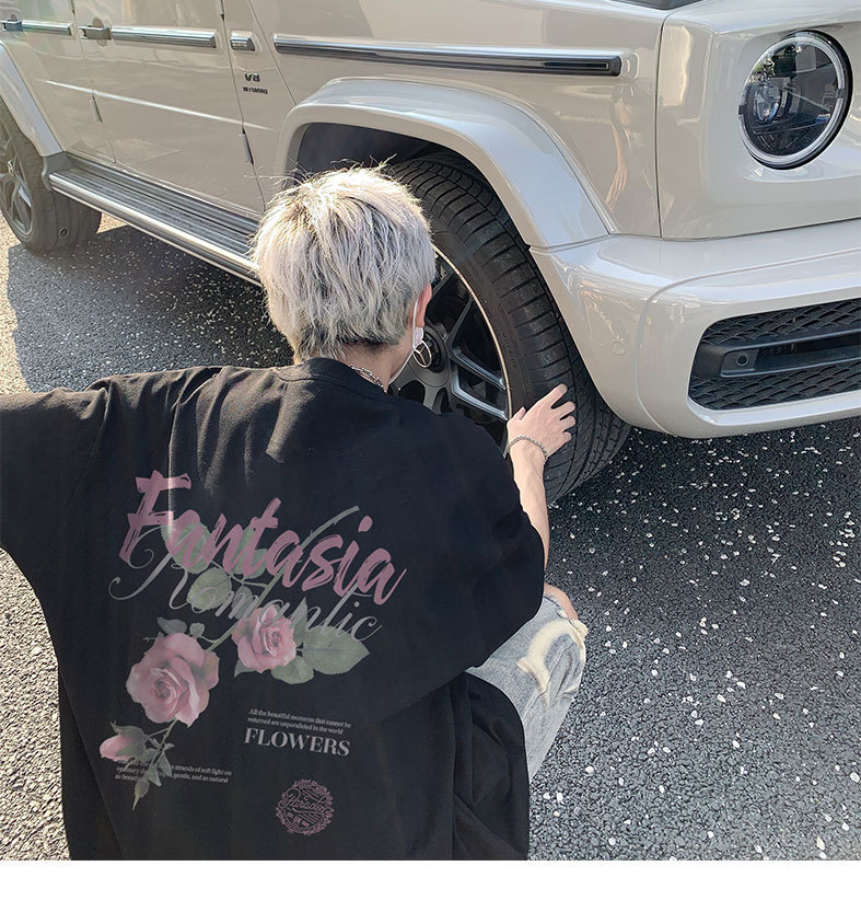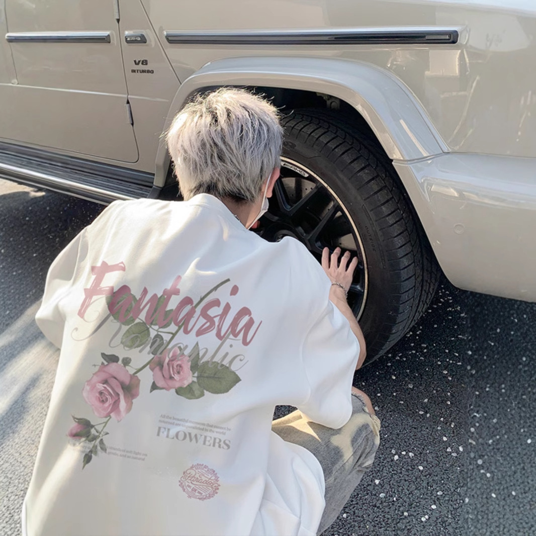 아메리칸 스타일 하이 스트리트 로즈 프린트 헤비 코튼 반팔 티셔츠 남성 여름 오버 사이즈 레트로 트렌디 브랜드 티셔츠