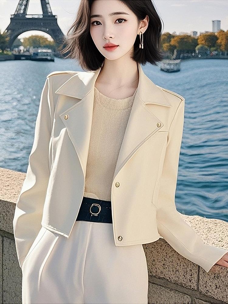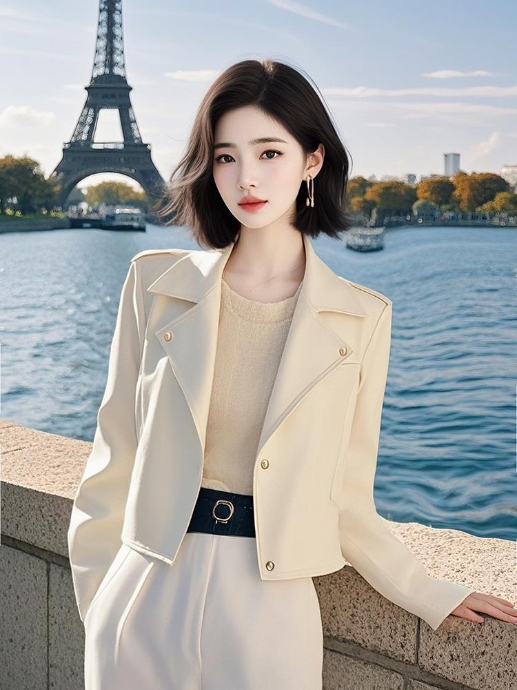 몸집이 작지만 멋지고 독특하며 매우 멋진 짧은 재킷, 여성용 고급 화이트 가죽 재킷, 초봄