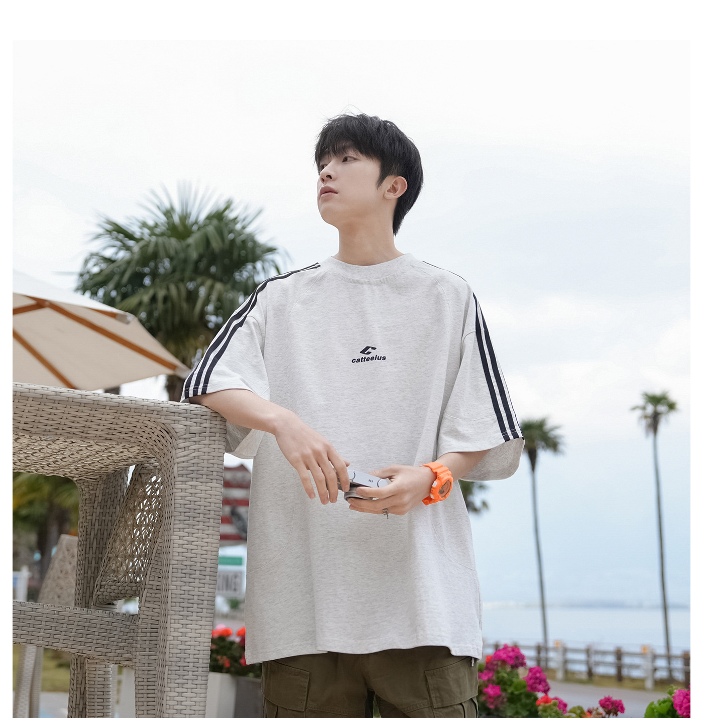 공장 직접 공급 220g 무거운면 줄무늬 반팔 티셔츠 남성 여름 미국 조수 브랜드 느슨한 반 소매 탑스토어 가기