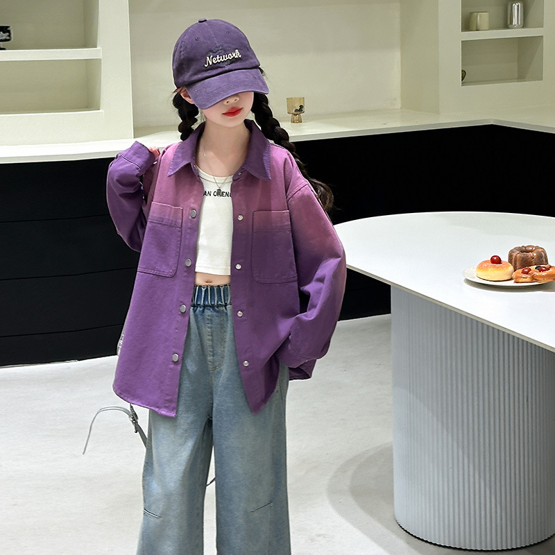 여아 봄 긴팔 그라데이션 셔츠 재킷 2025 세련된 아동 봄, 가을 옷 중대형 아동용 상의