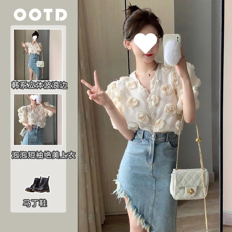 여름 샤넬 스타일 세트 여성 2025 새로운 달콤한 서양 스타일 꽃 셔츠 탑 데님 스커트 투피스 세트스토어 가기