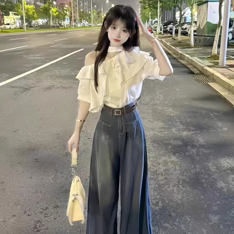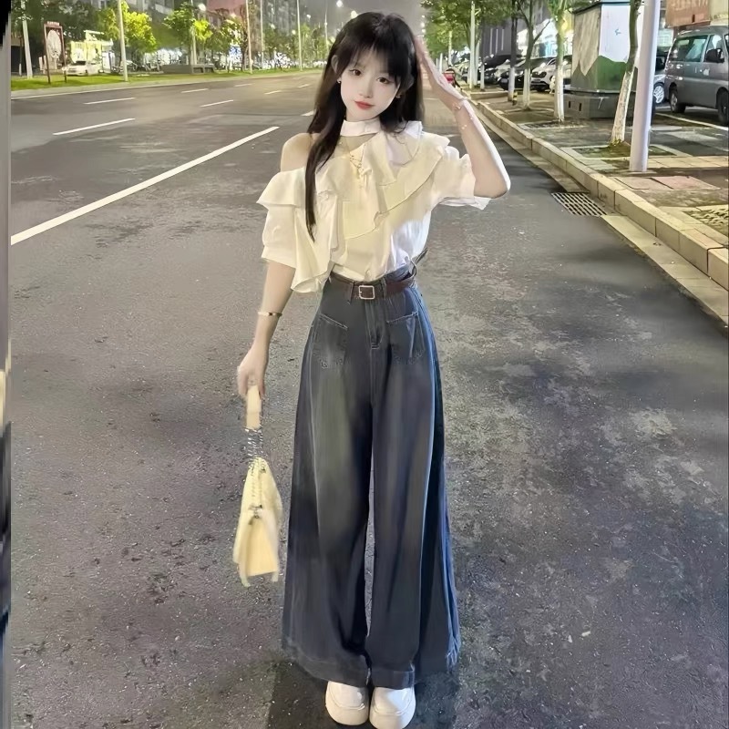 패션 세트 니슈 러플 숄더 셔츠 탑 하이 허리 데님 와이드 레그 바지 투피스 세트 여성