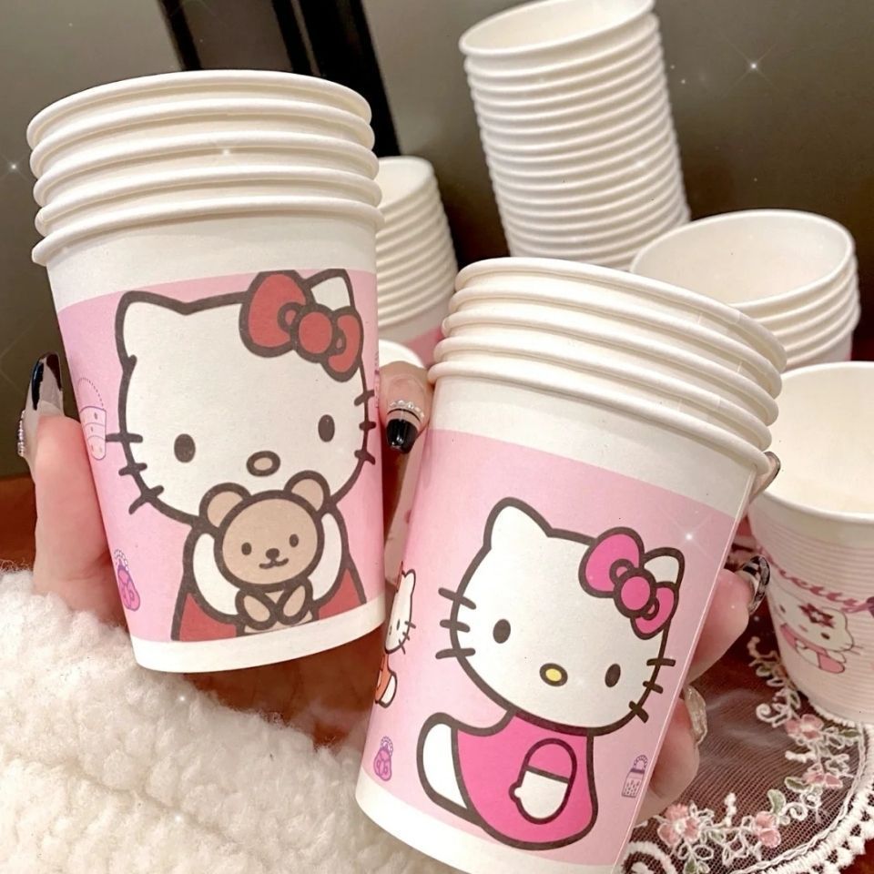 ∝ 귀여운 만화 헬로 키티 종이컵 일회용 컵 핑크 KT 컵 홈 오피스 두꺼운 종이컵