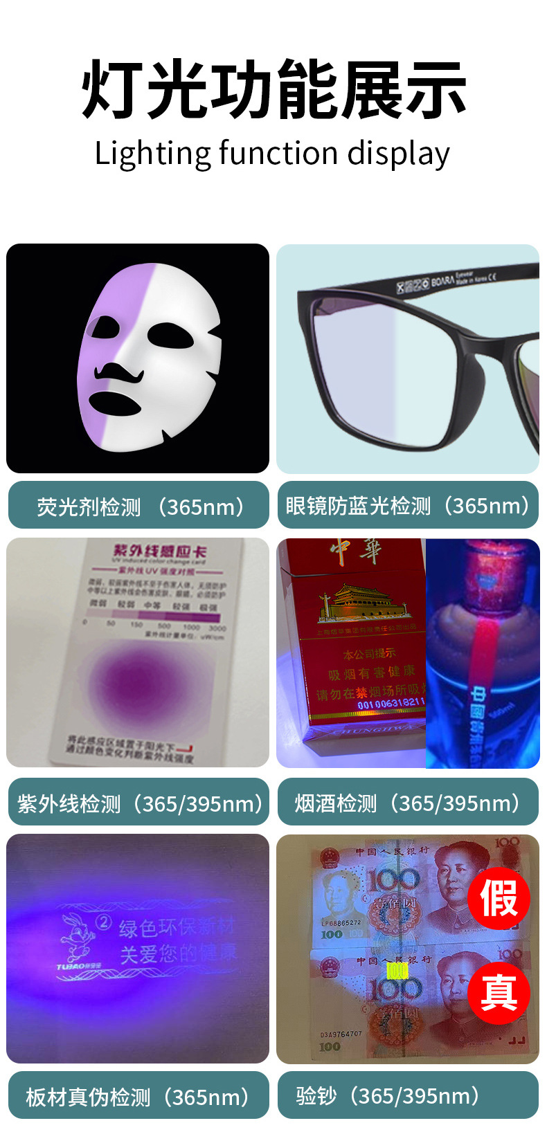 备注:395nm波段灯光偏紫色:适用于验钞、UV固化、烟酒防伪检测