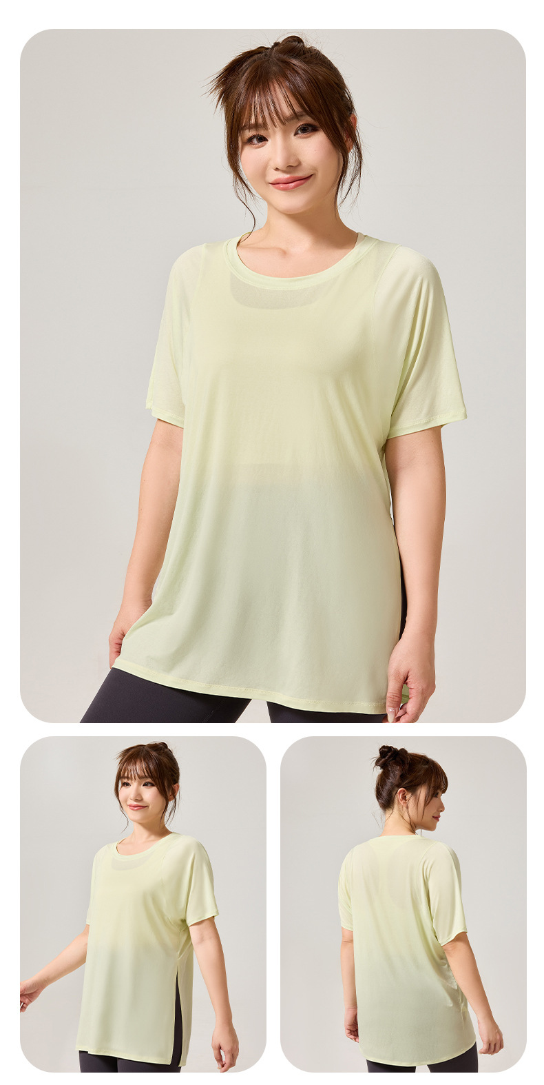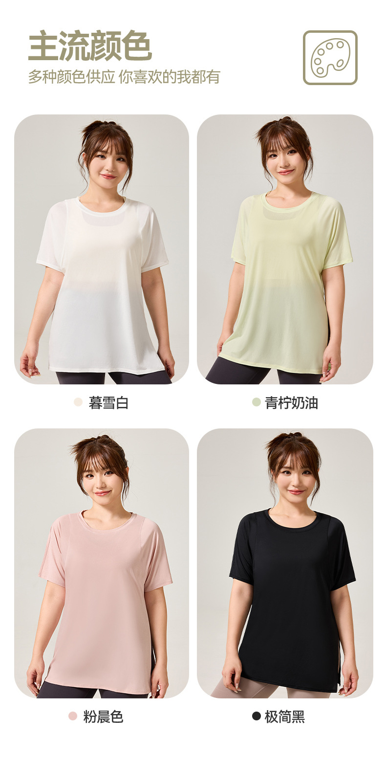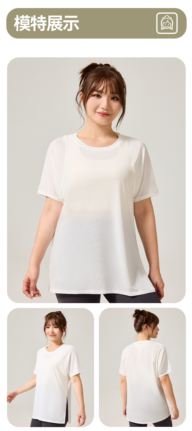 대외 무역 플러스 사이즈 스포츠 요가복 짧은 탑 루즈 라운드 넥 메쉬 스플 라이스 속건성 아름다운 등 반팔 피트니스웨어