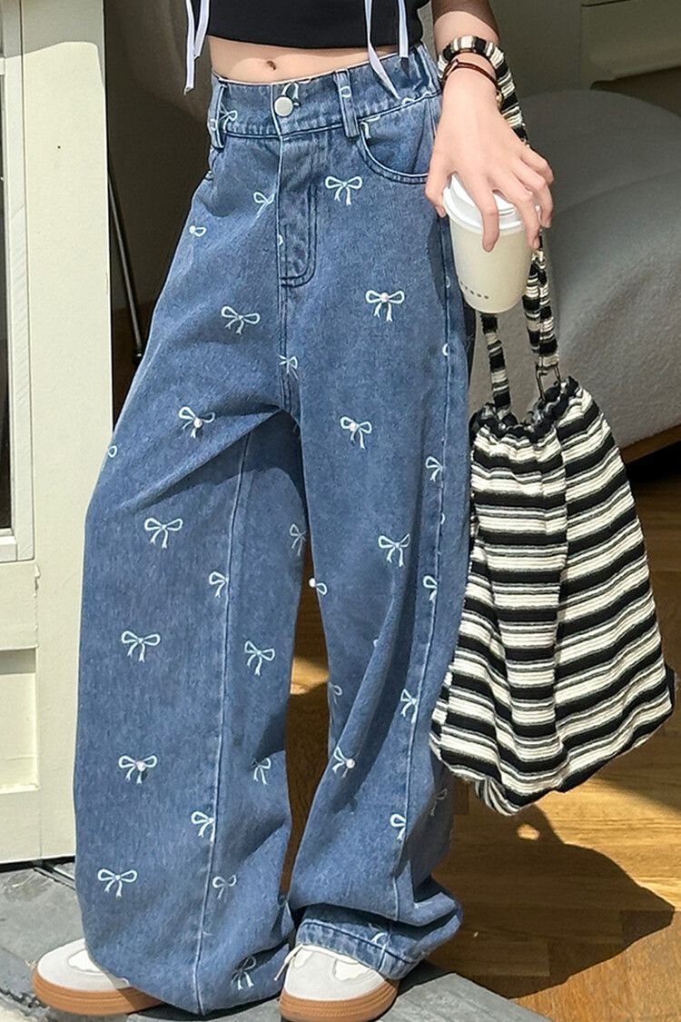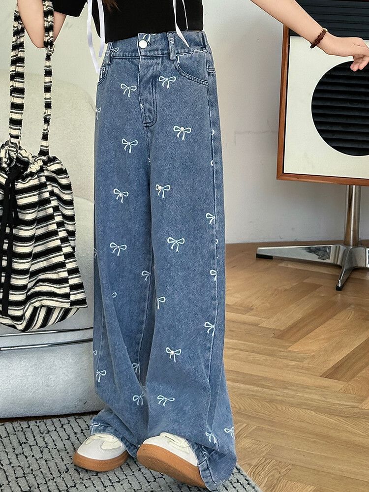 소녀의 빈티지 세탁 블루 활 프린트 구슬 청바지 여름 어린이 높은 허리 넓은 다리 바지스토어 가기