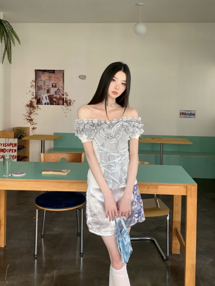 여성 티셔츠 디자인 센스 틈새 한 캐릭터 칼라 웨이브 레이스 반팔 슬림 슬리밍 스파이스 소녀 여름 짧은 우아한 탑