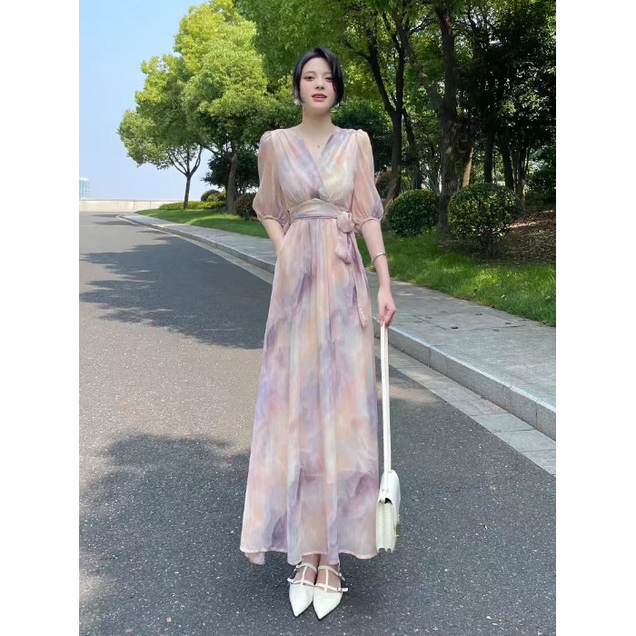 꽃 원피스 여성의 2025 여름 새로운 디자인 센스 우아한 타이트 허리 슬리밍 티 브레이크 프렌치 레이스 업 롱 스커트스토어 가기