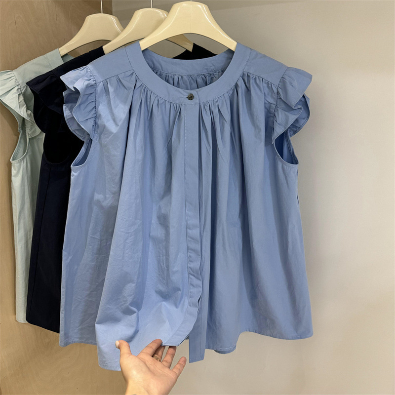 디자인 감각 달콤한 작은 인형 셔츠 비행 소매 솔리드 컬러 라운드 넥 셔츠 여성의 여름 Xiazhong 민소매 세련된 톱 여성