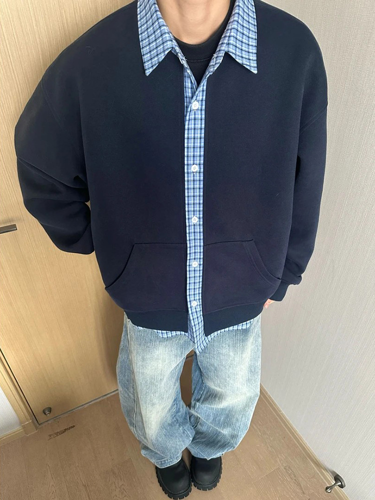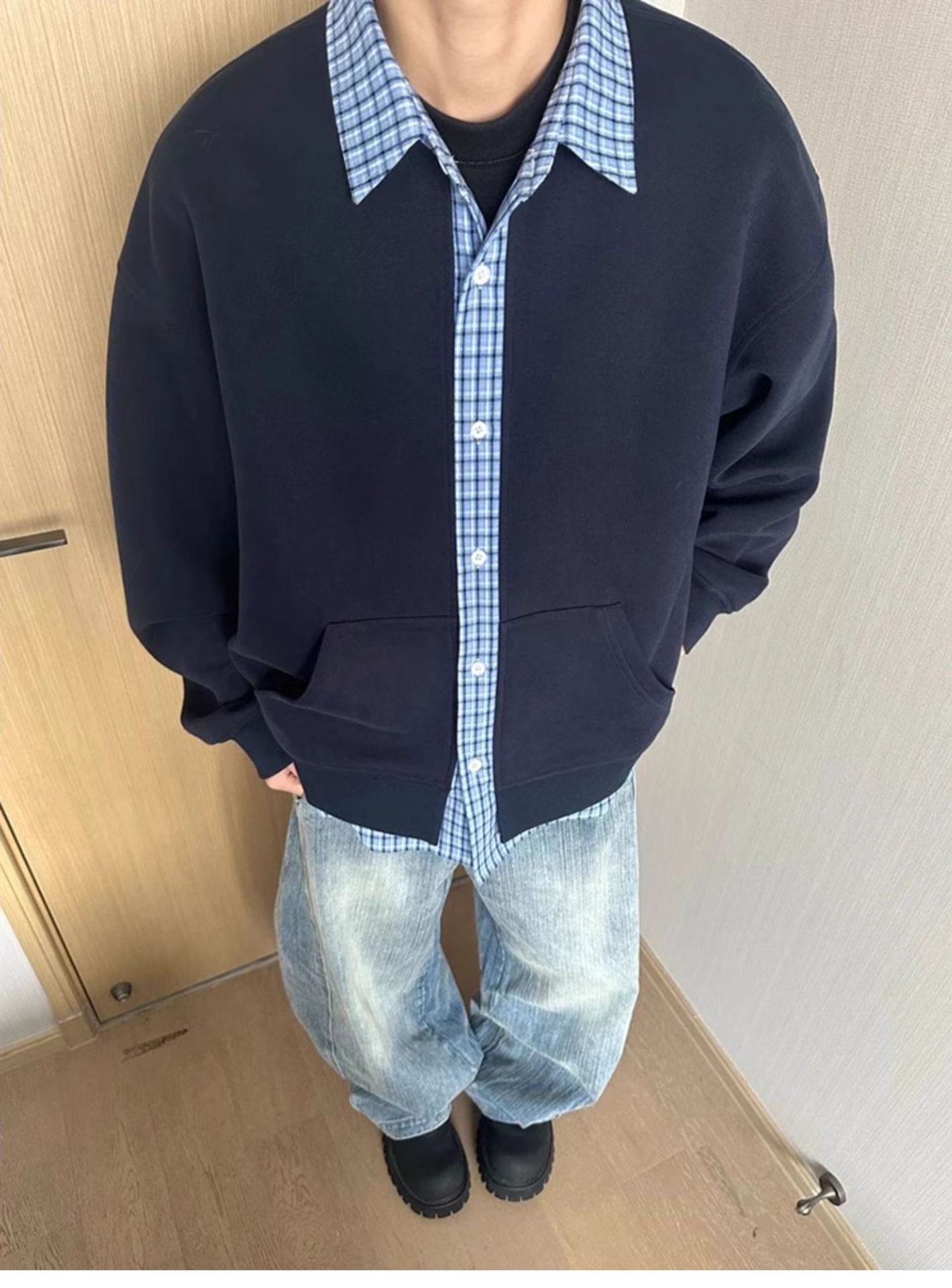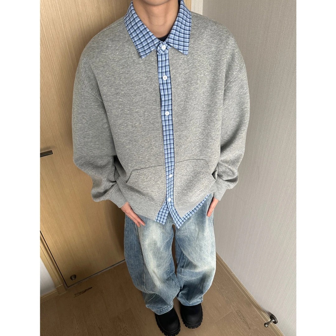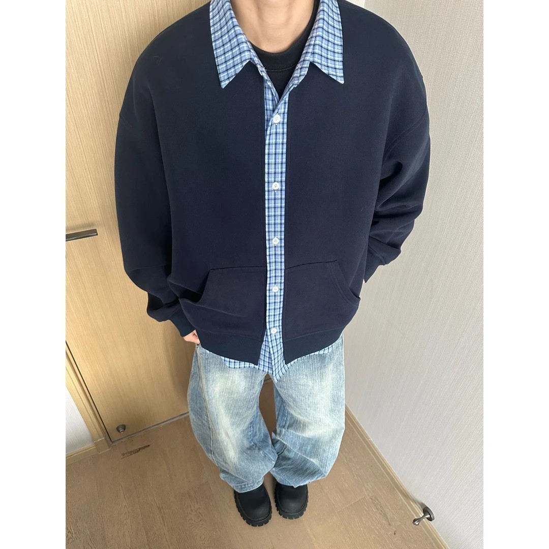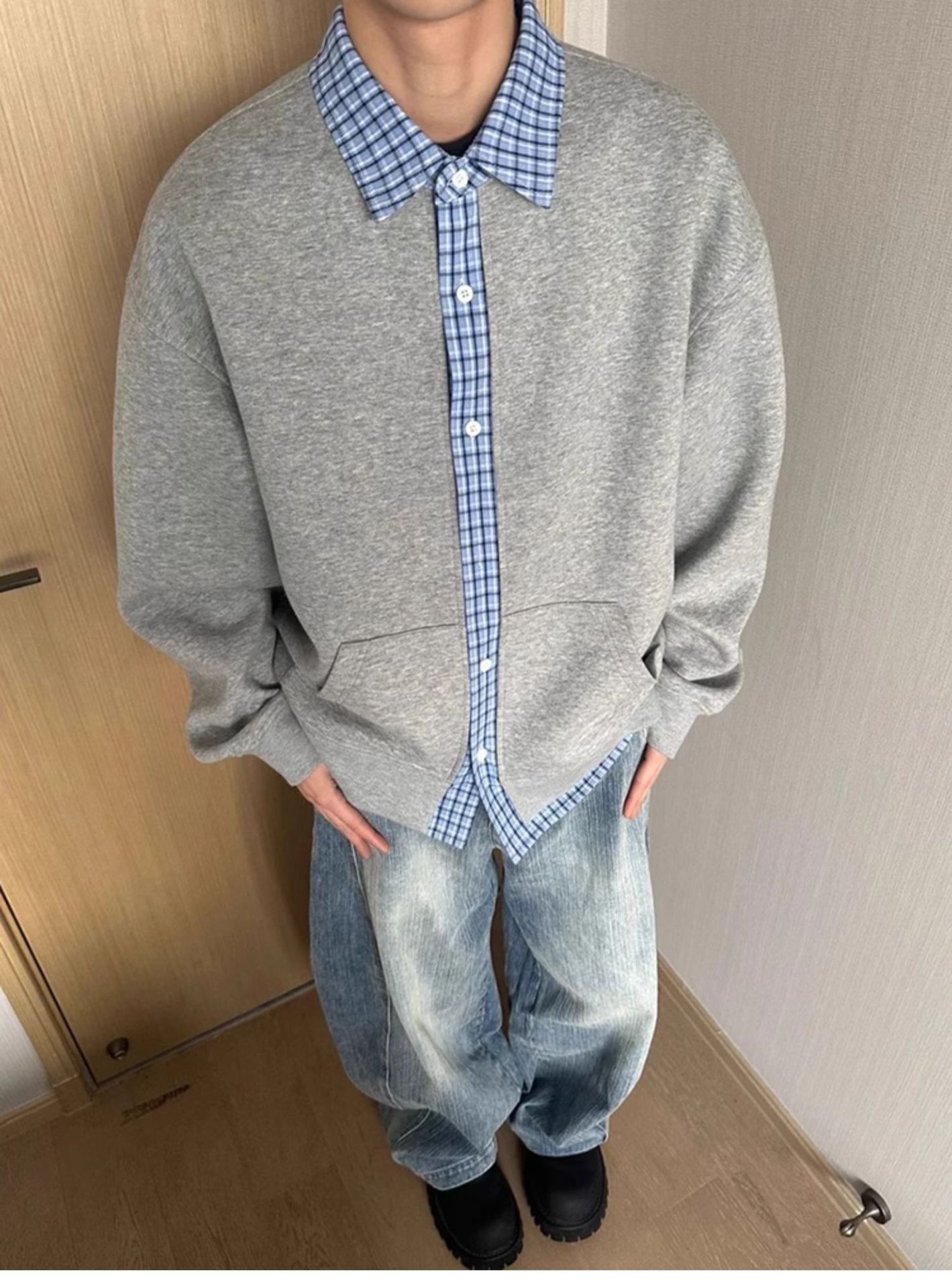 가짜 투피스 스티칭 격자 무늬 옷깃 스웨트 셔츠 남성 십대 ootd 착용 셔츠 재킷 헤비 커플 재킷스토어 가기