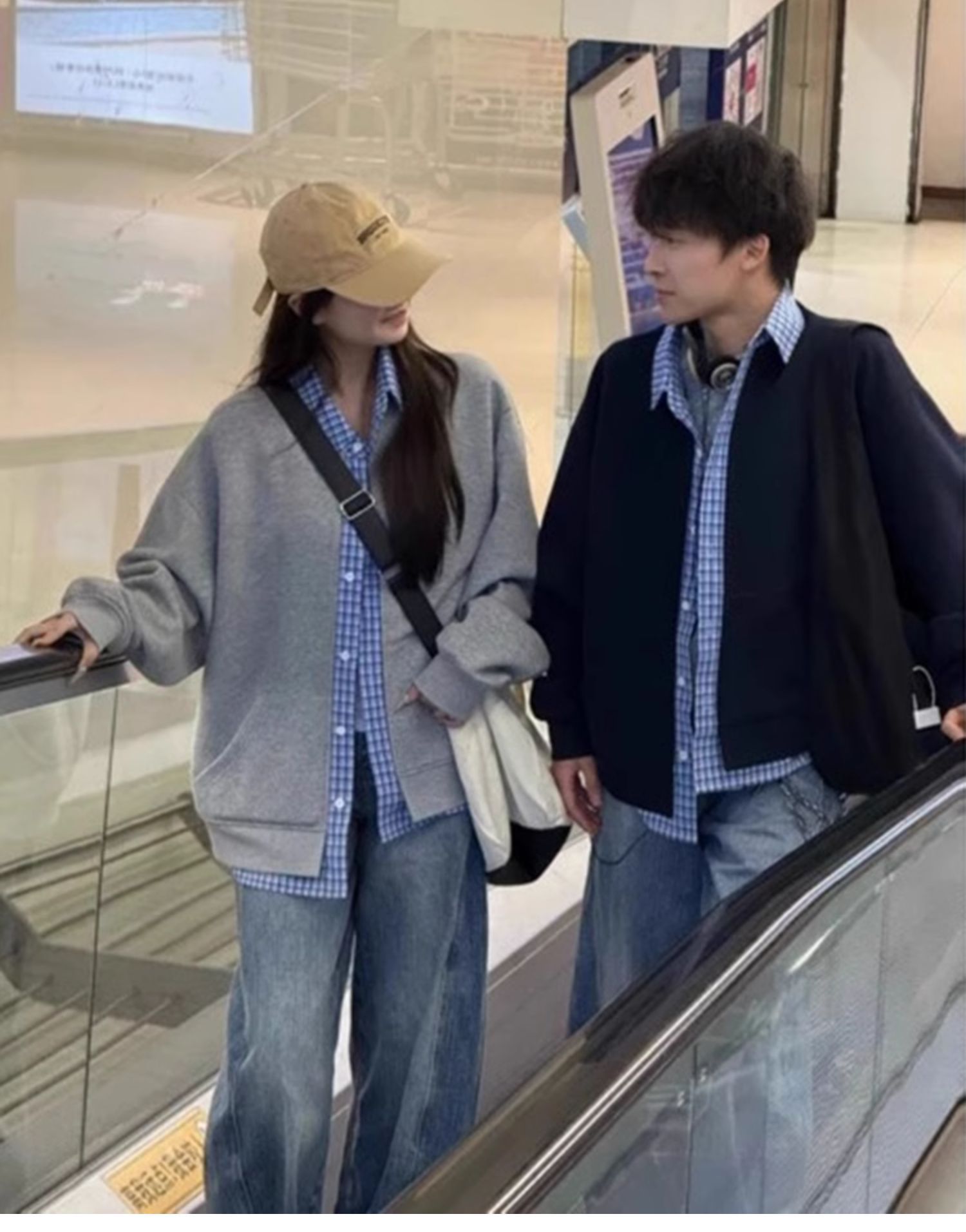 가짜 투피스 스티칭 격자 무늬 옷깃 스웨트 셔츠 남성 십대 ootd 착용 셔츠 재킷 헤비 커플 재킷