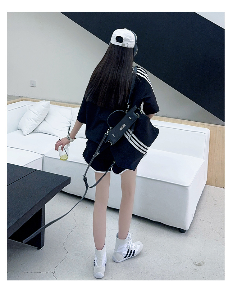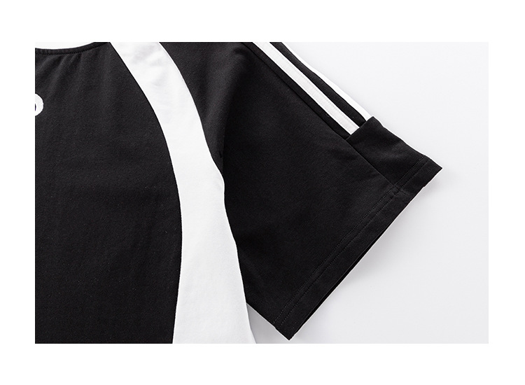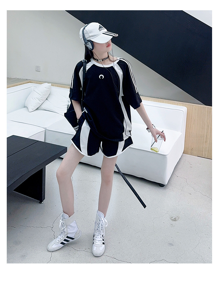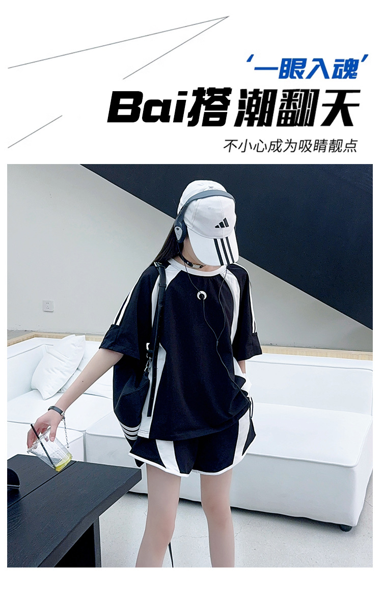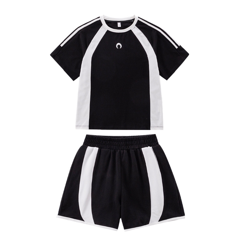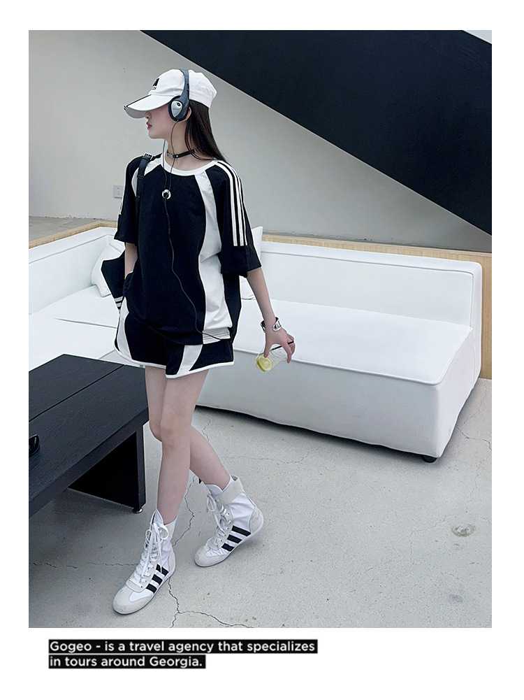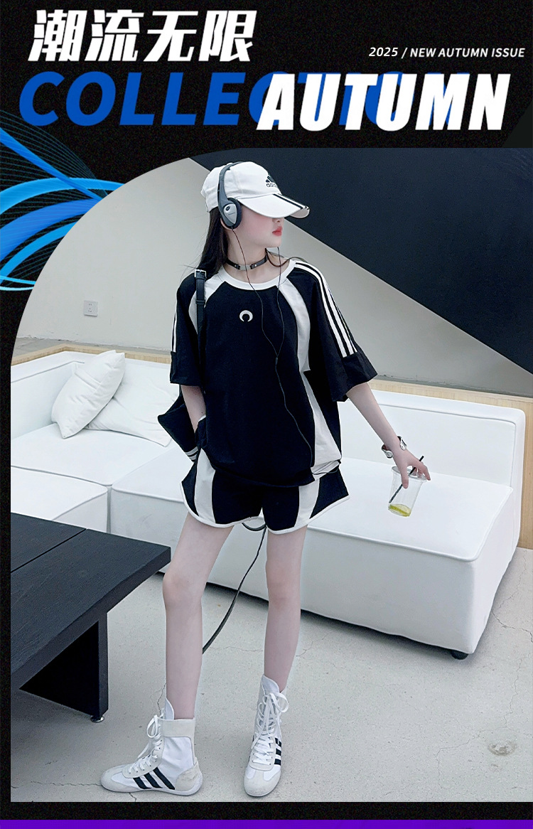 소녀 스포츠 세트 2025 여름 새로운 서양 소녀 느슨한 초월 인쇄 흑백 컬러 세트 트렌디스토어 가기