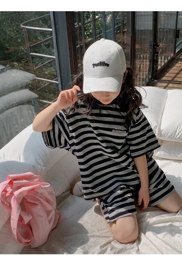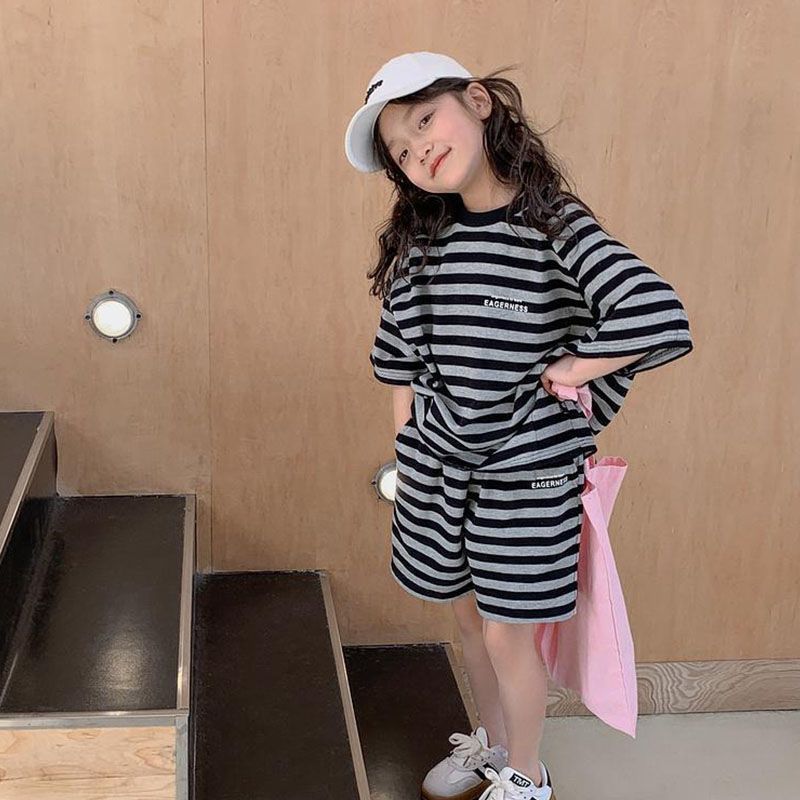 흑백 줄무늬 캐주얼 세트 여자 2025 년 여름 신상 소녀 한국식 풀오버 반팔 반바지 투피스 세트스토어 가기