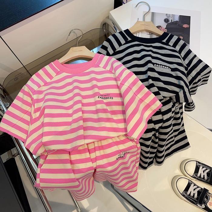 흑백 줄무늬 캐주얼 세트 여자 2025 년 여름 신상 소녀 한국식 풀오버 반팔 반바지 투피스 세트