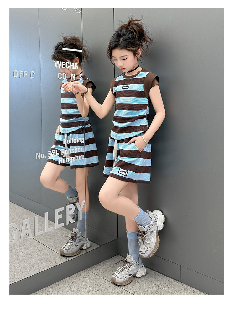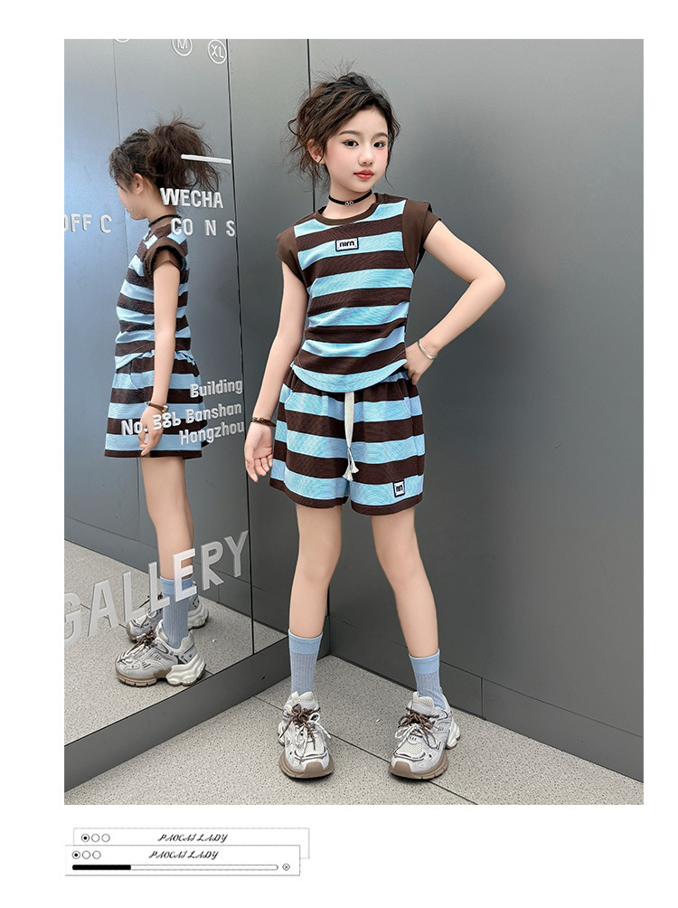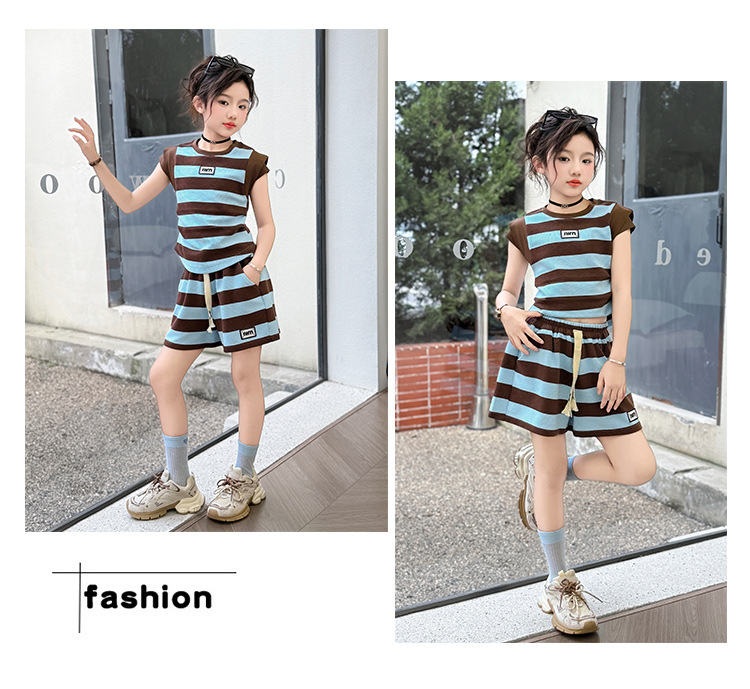 소녀 여름 세트 얇은 느슨한 줄무늬 스포츠 외국식 어린이 아기 옷 어린 소녀 캐주얼 옷 세트스토어 가기