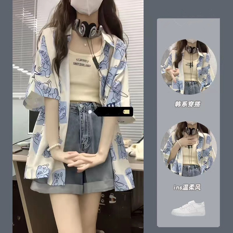 여름 소금 느슨한 올매치 베어 탑 반팔 셔츠 스트랩 데님 반바지 세트 3 피스 세트 세트스토어 가기