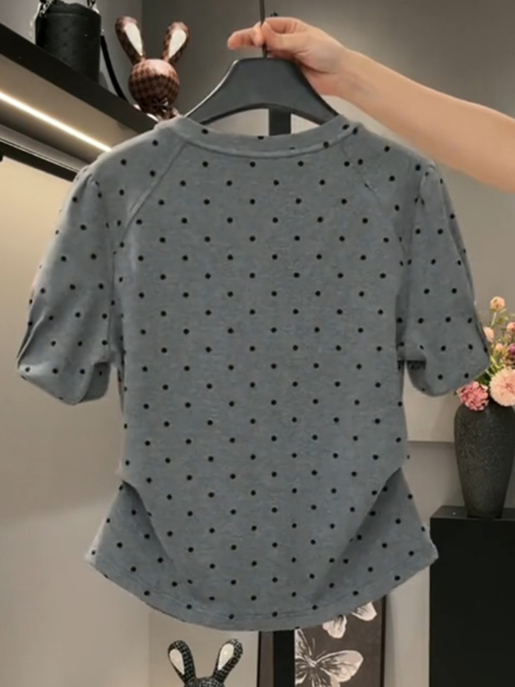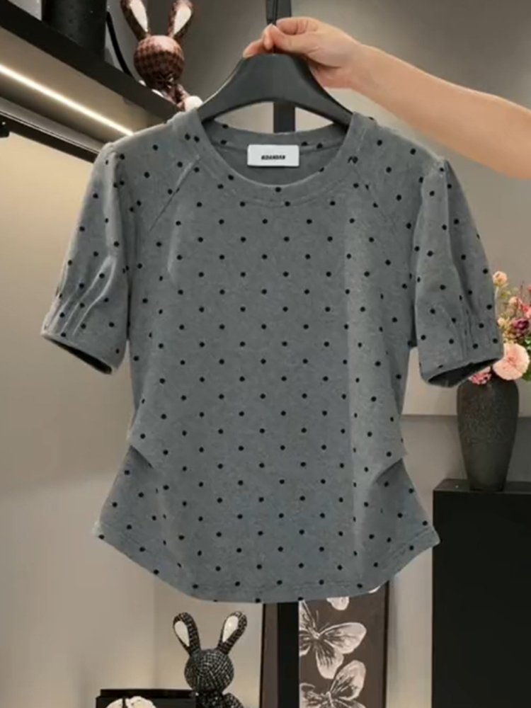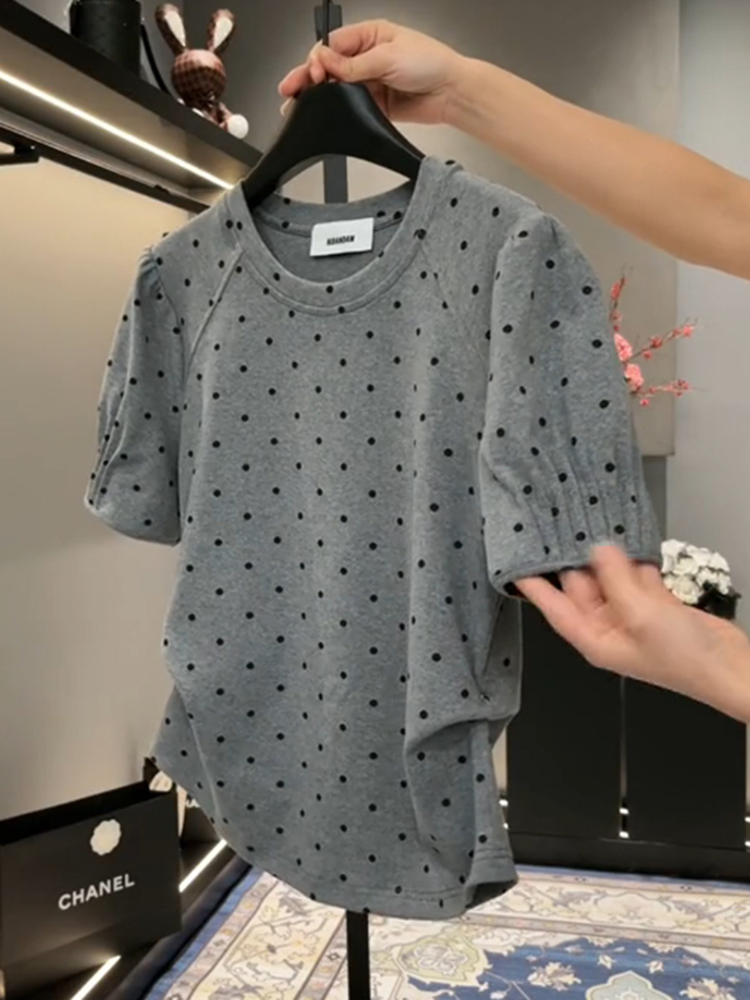 플러스 사이즈 통통녀 그레이 폴로 도트 숄더 반팔 티셔츠 2025 새로운 디자인 센스 틈새 자이언트 슬림 탑