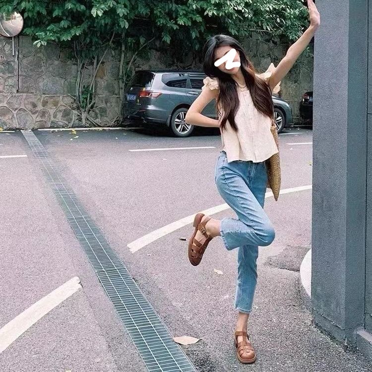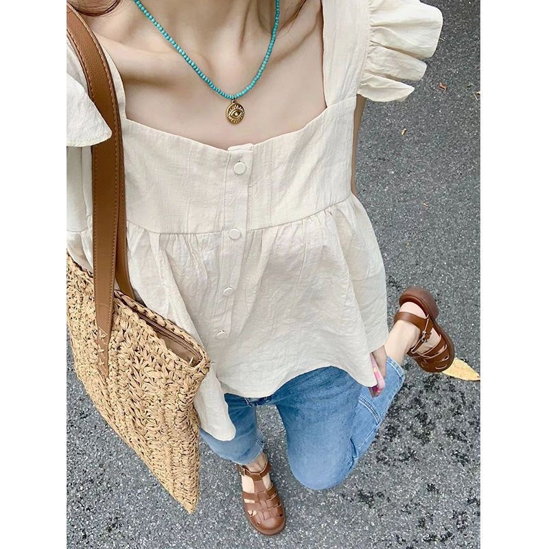 프랑스 스타일 스퀘어 칼라 작은 플라이 슬리브 체크 무늬 셔츠 여성 여름 한국 스타일 부드러운 달콤하고 매운 시대 감소 민소매 탑스토어 가기