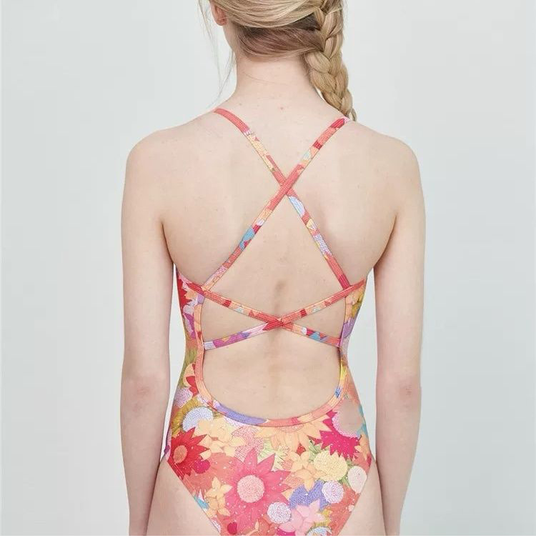 새로운 해바라기 원피스 수영복, 여성스럽고 달콤한 소녀 슬림 백리스 레이싱 수영복, 섹시한 원피스
