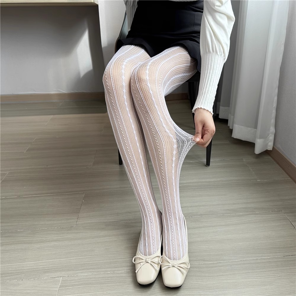 • 자카드 세로줄무늬 피쉬넷 스타킹 화이트