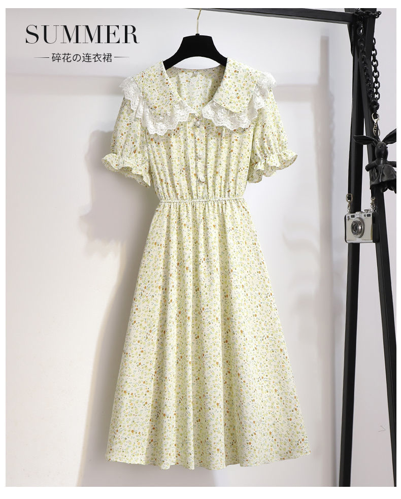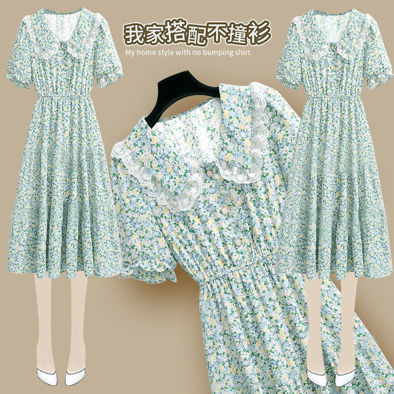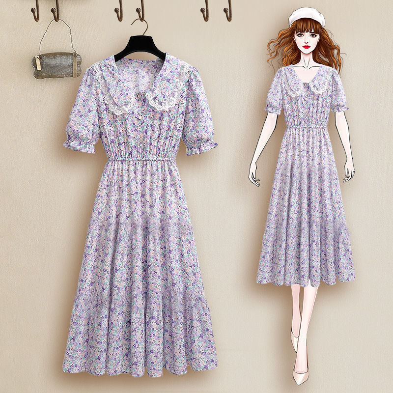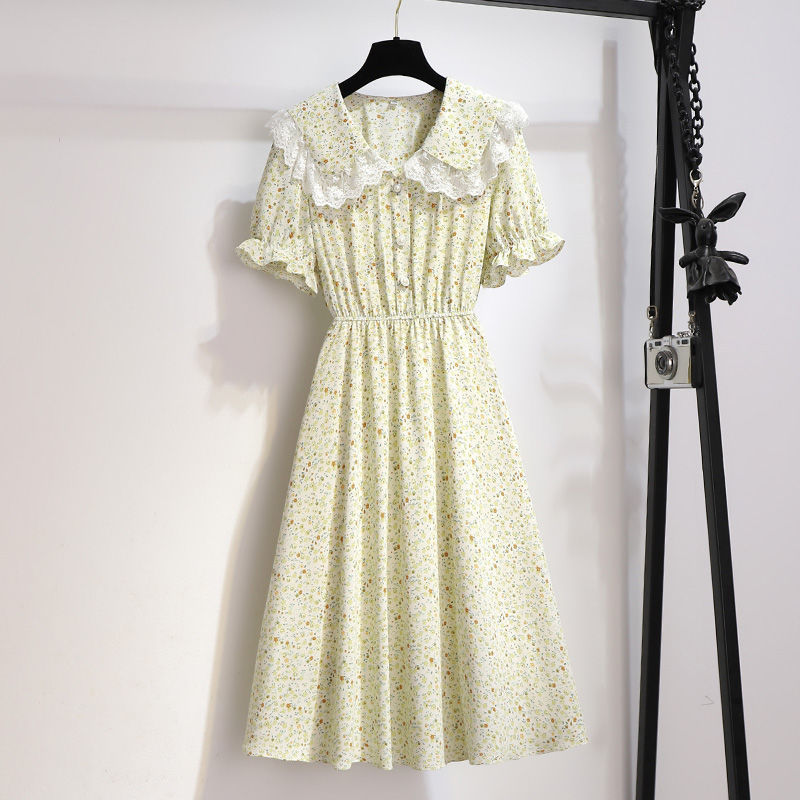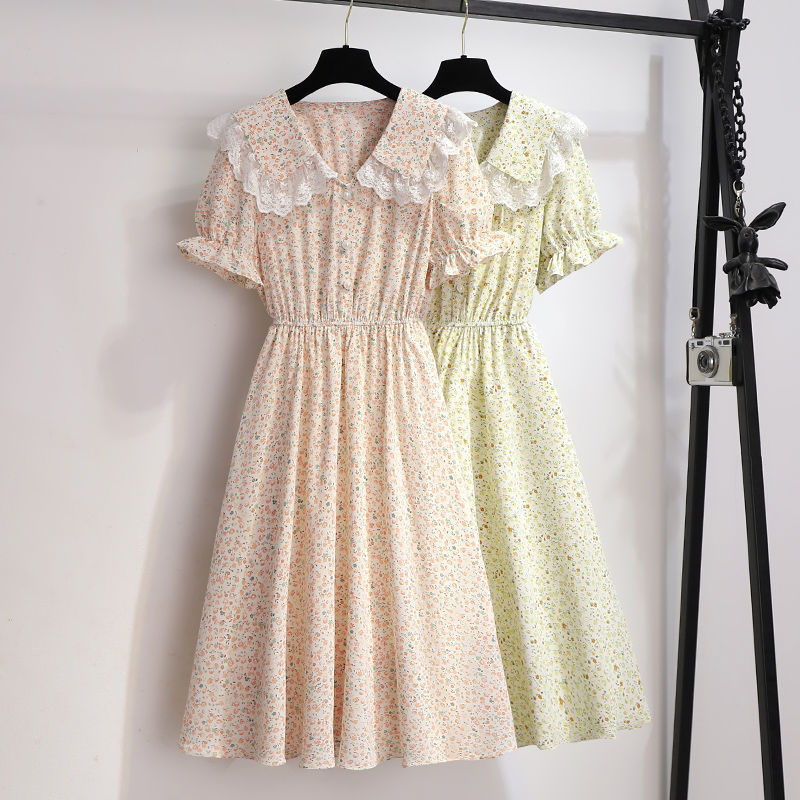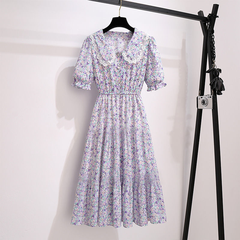 신선한 스타일 새로운 쉬폰 꽃 원피스 여성 여름 프랑스 스타일 나이 감소 달콤한 인형 칼라 웨이스트 슬리밍 스커트