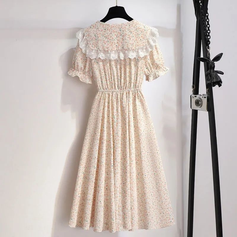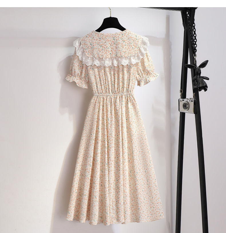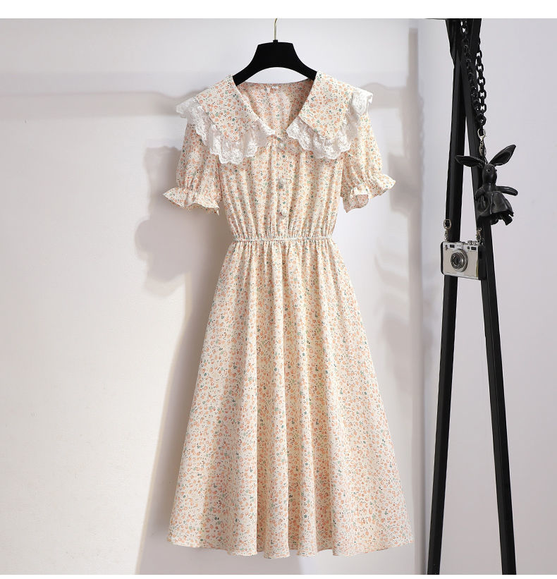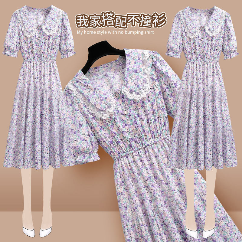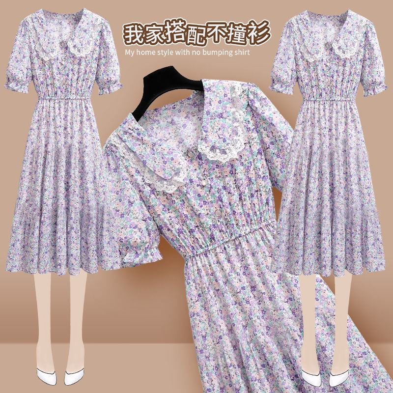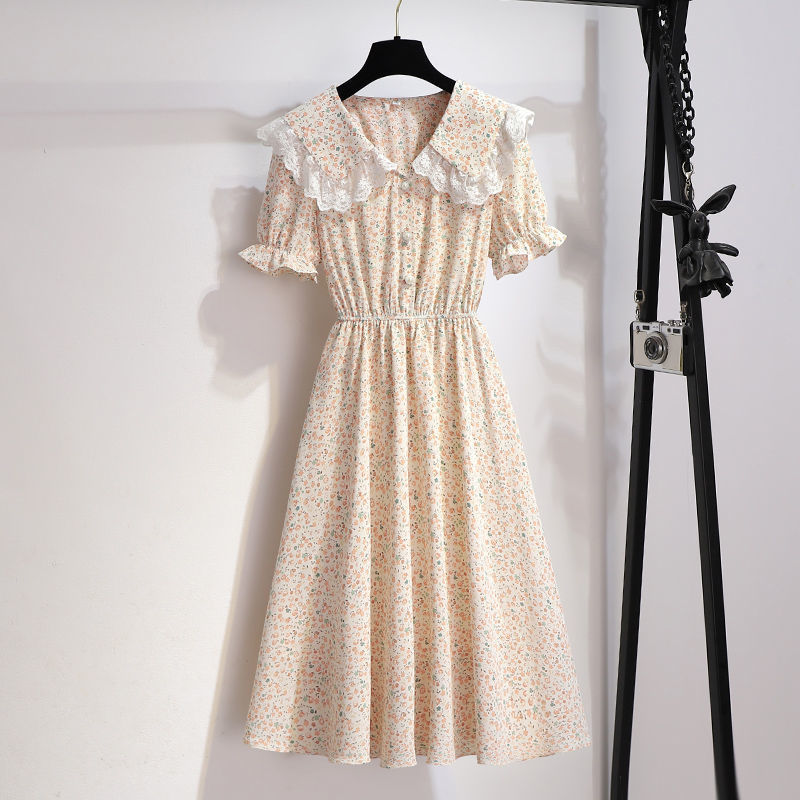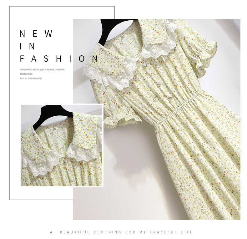 신선한 스타일 새로운 쉬폰 꽃 원피스 여성 여름 프랑스 스타일 나이 감소 달콤한 인형 칼라 웨이스트 슬리밍 스커트
