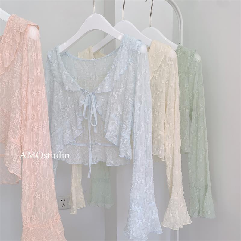 러플 슈퍼 페어리 레이스 선스크린 카디건 여름 얇은 레이스 업 웨이스트 코트 블라우스 긴 소매 목도리 대외 무역 헤어스토어 가기