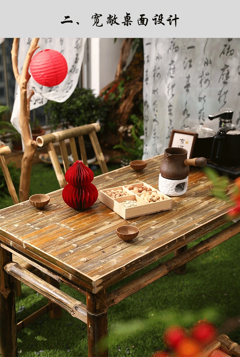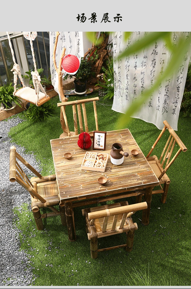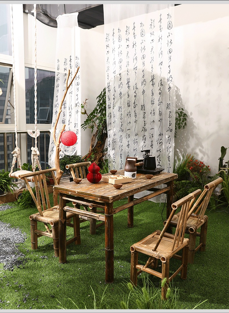 대나무 의자와 대나무 테이블 조합 야외 안뜰 레저 식사 및 차 테이블 향수 복고풍 스타일 수제 구식 대나무 테이블 g&