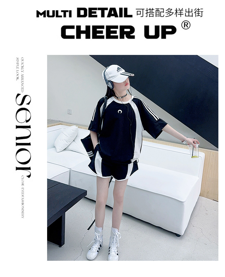 국경 간 여자 반팔 스포츠 세트 2025 새로운 어린이 캐주얼 반팔 티셔츠 느슨한 반바지 투피스 유행 세트