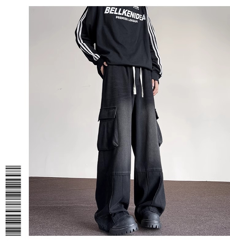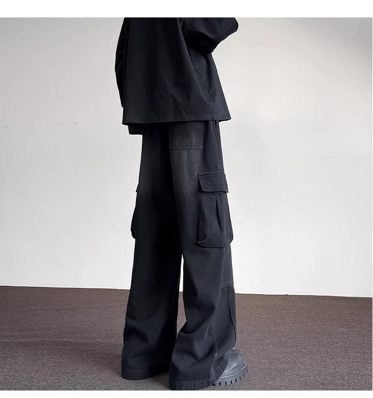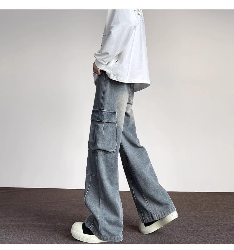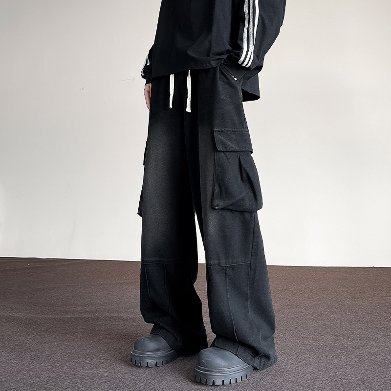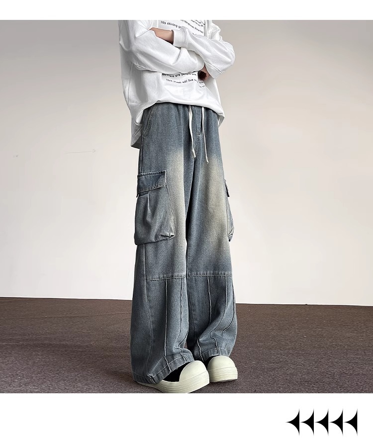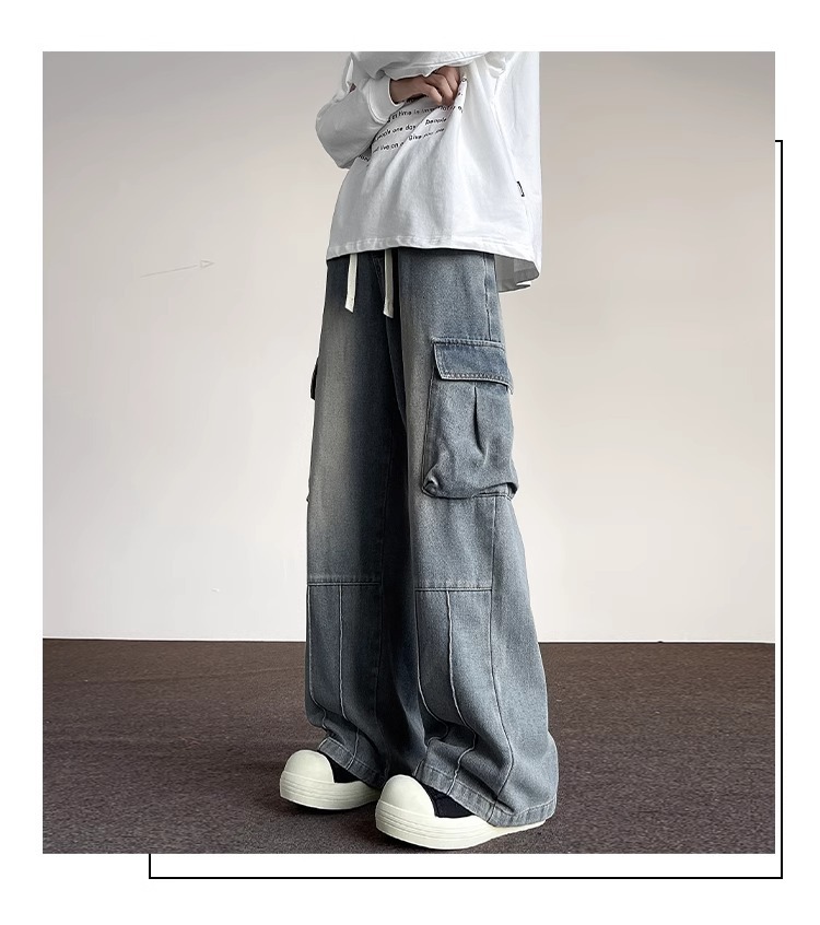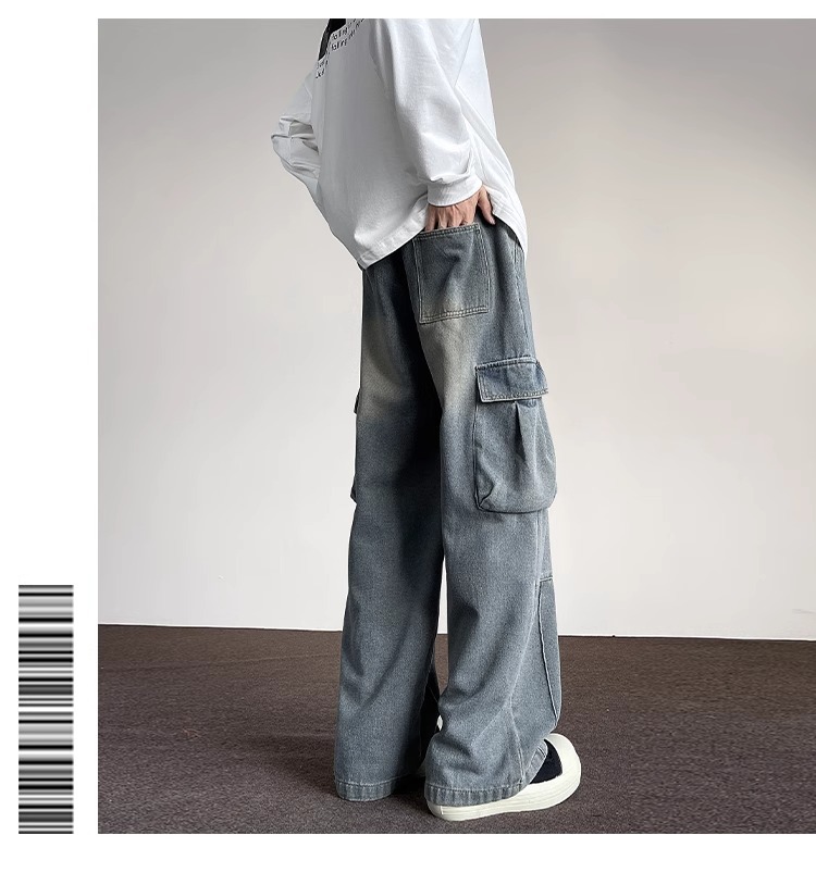 포켓 워크 진 남성 스트레이트 루즈 와이드 레그 아메리칸 하이 스트리트 팬츠 트렌디 브랜드 핸섬 워싱 레트로 팬츠