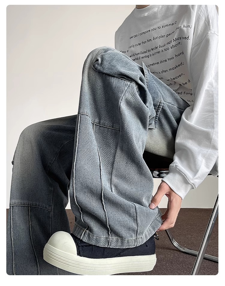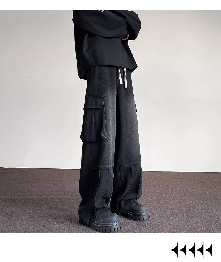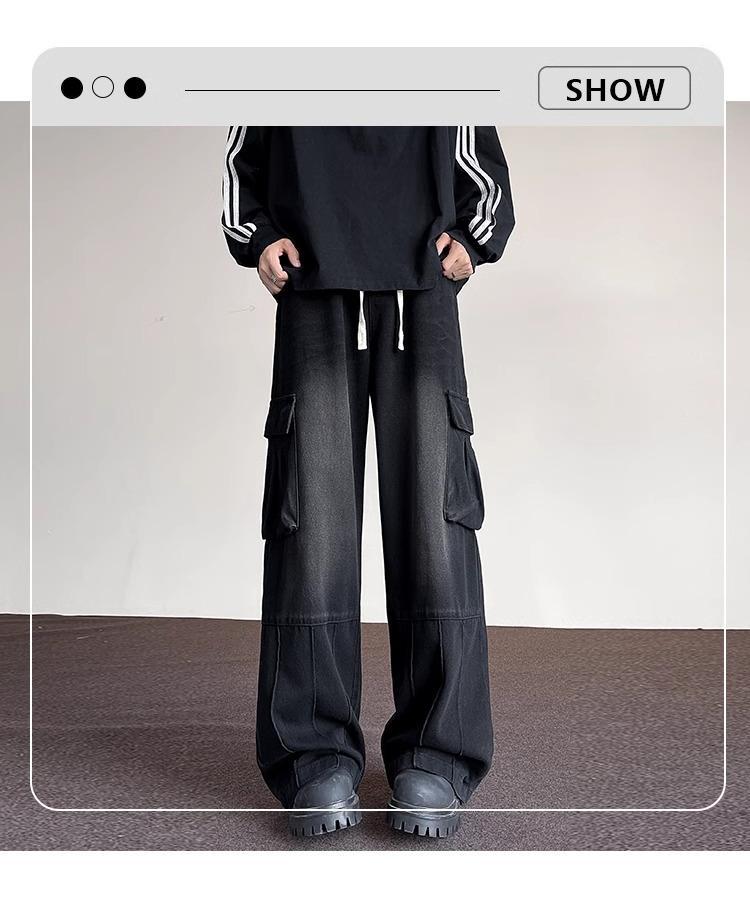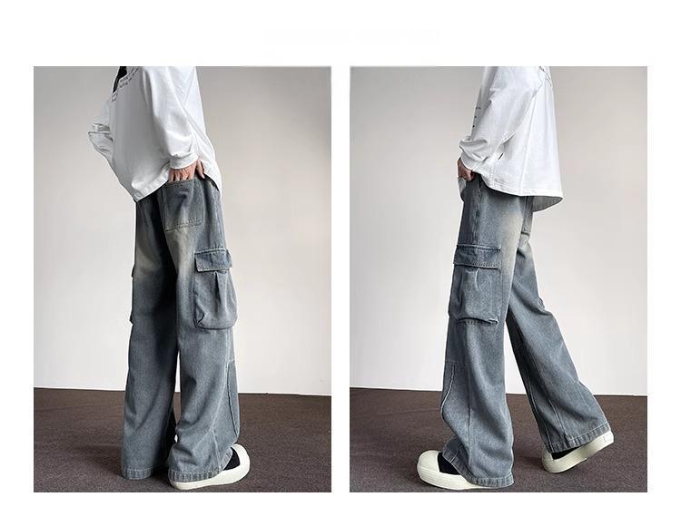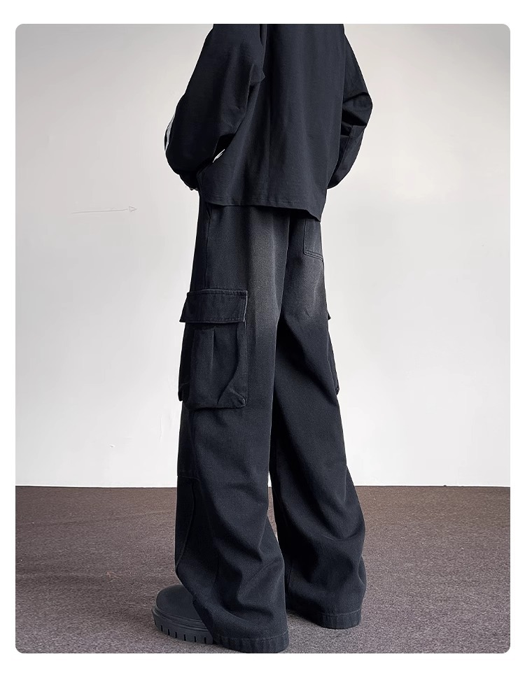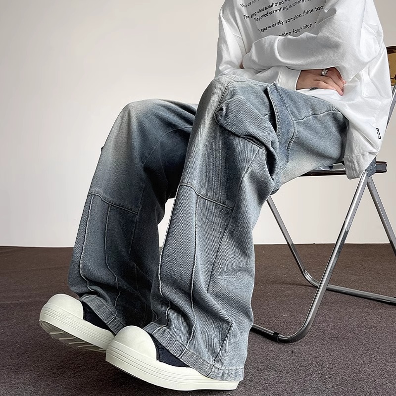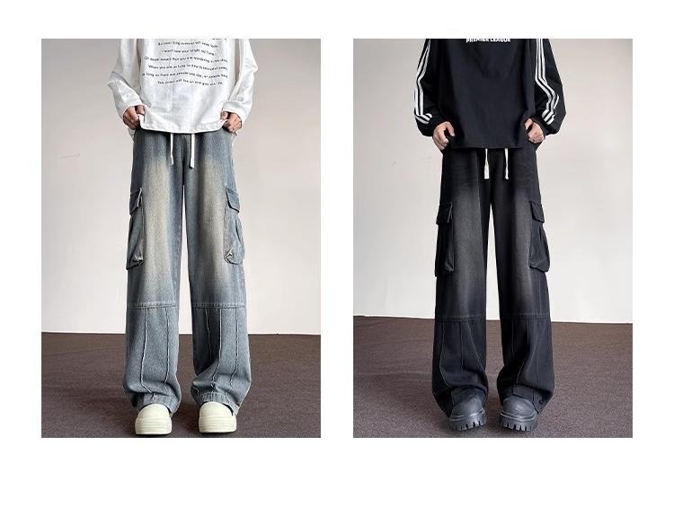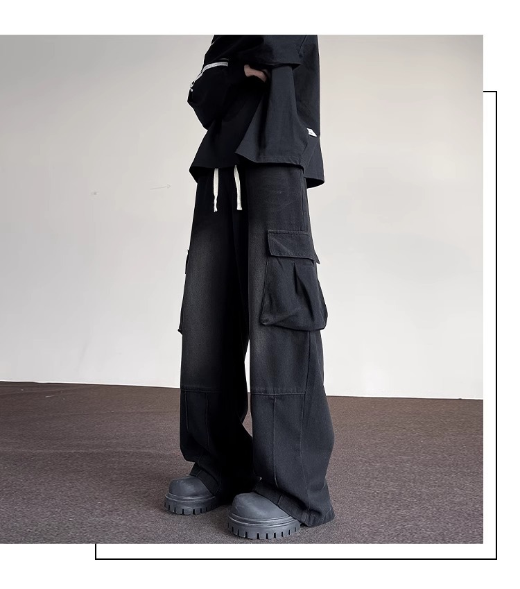 포켓 워크 진 남성 스트레이트 루즈 와이드 레그 아메리칸 하이 스트리트 팬츠 트렌디 브랜드 핸섬 워싱 레트로 팬츠