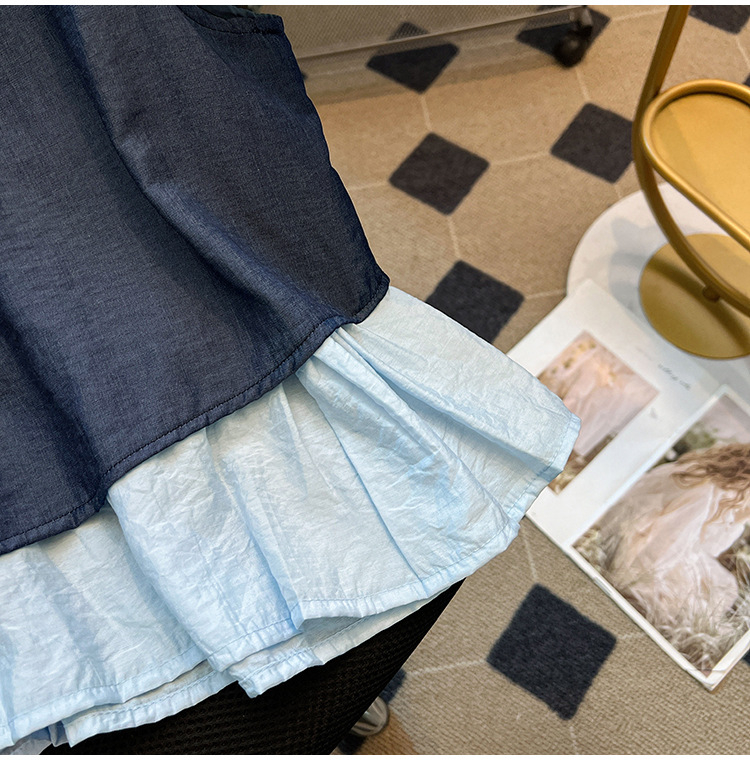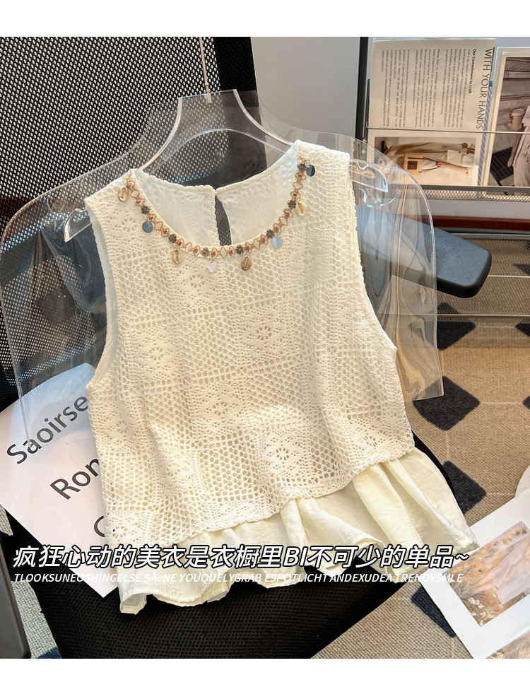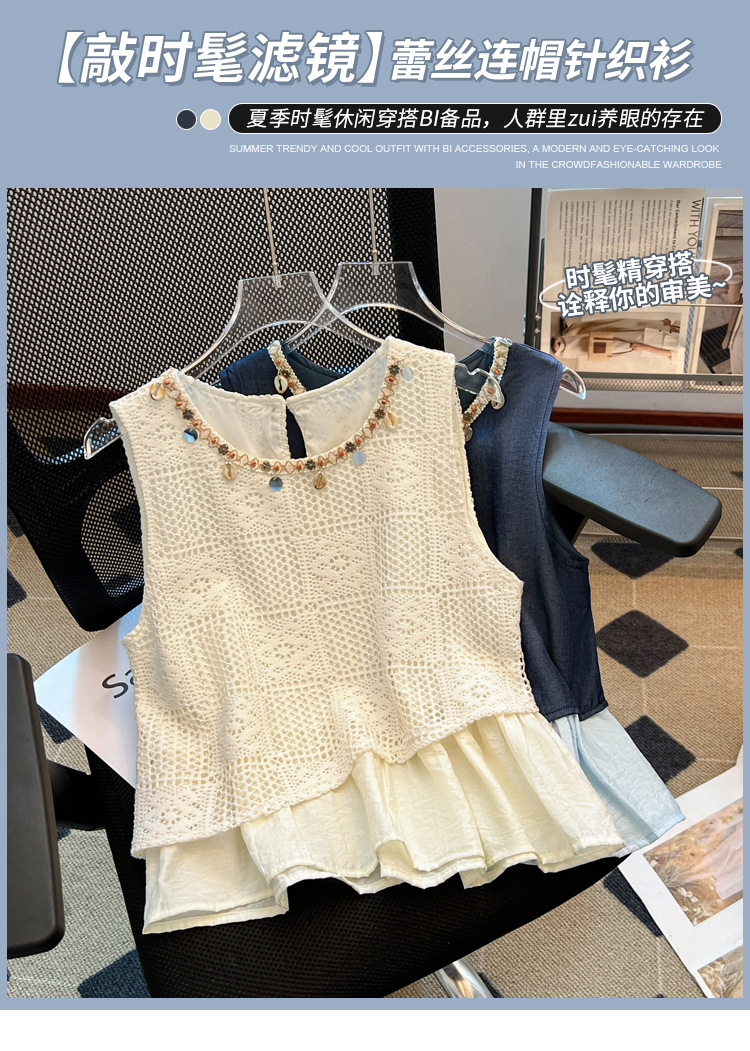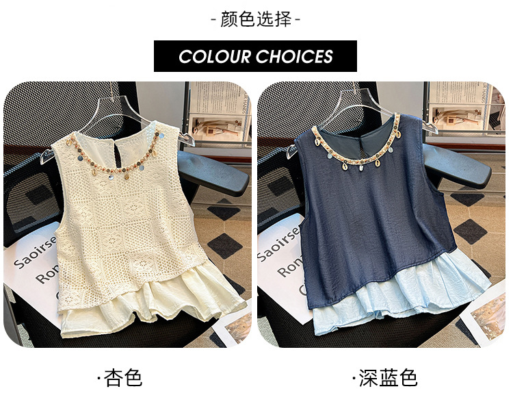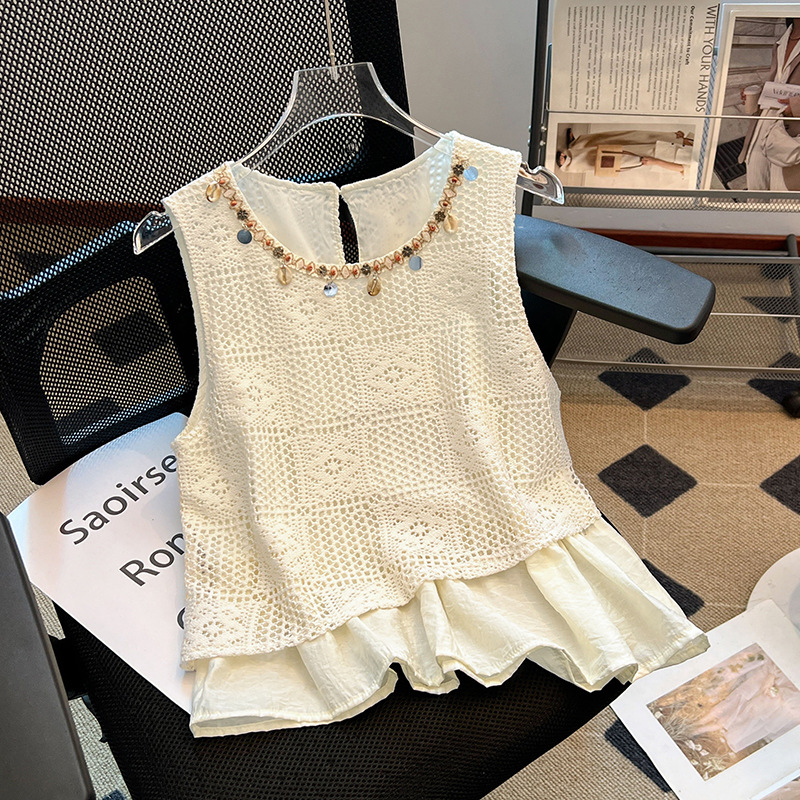달콤한 스타일 가짜 두 조각 빈 민소매 셔츠 여성의 여름 새로운 서양 스타일 나이 감소 스티칭 짧은 티셔츠