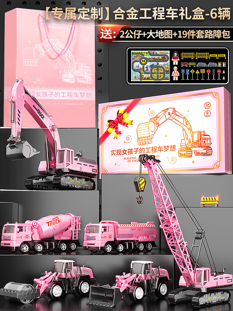 • 고급 핑크 소녀 선물 상자 [합금 핑크 엔지니어링 차량 선물 상자] 지도가 포함된 엔지니어링 차량 6대 + 로드블록 선물 가방 + 미니피겨 2개 + 선물 가방