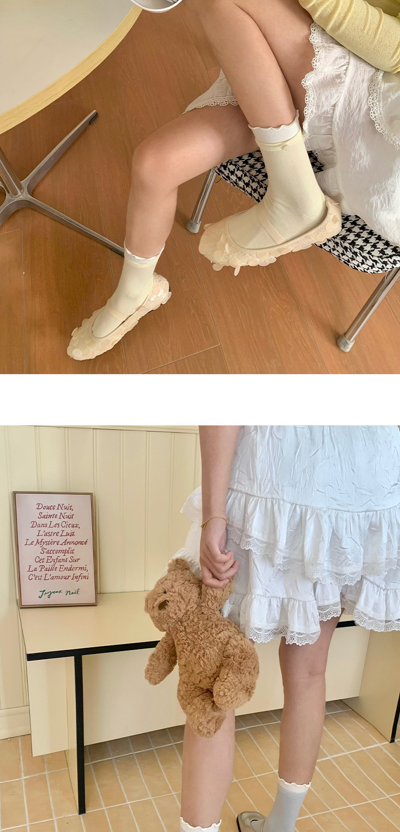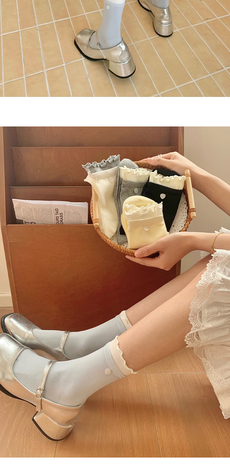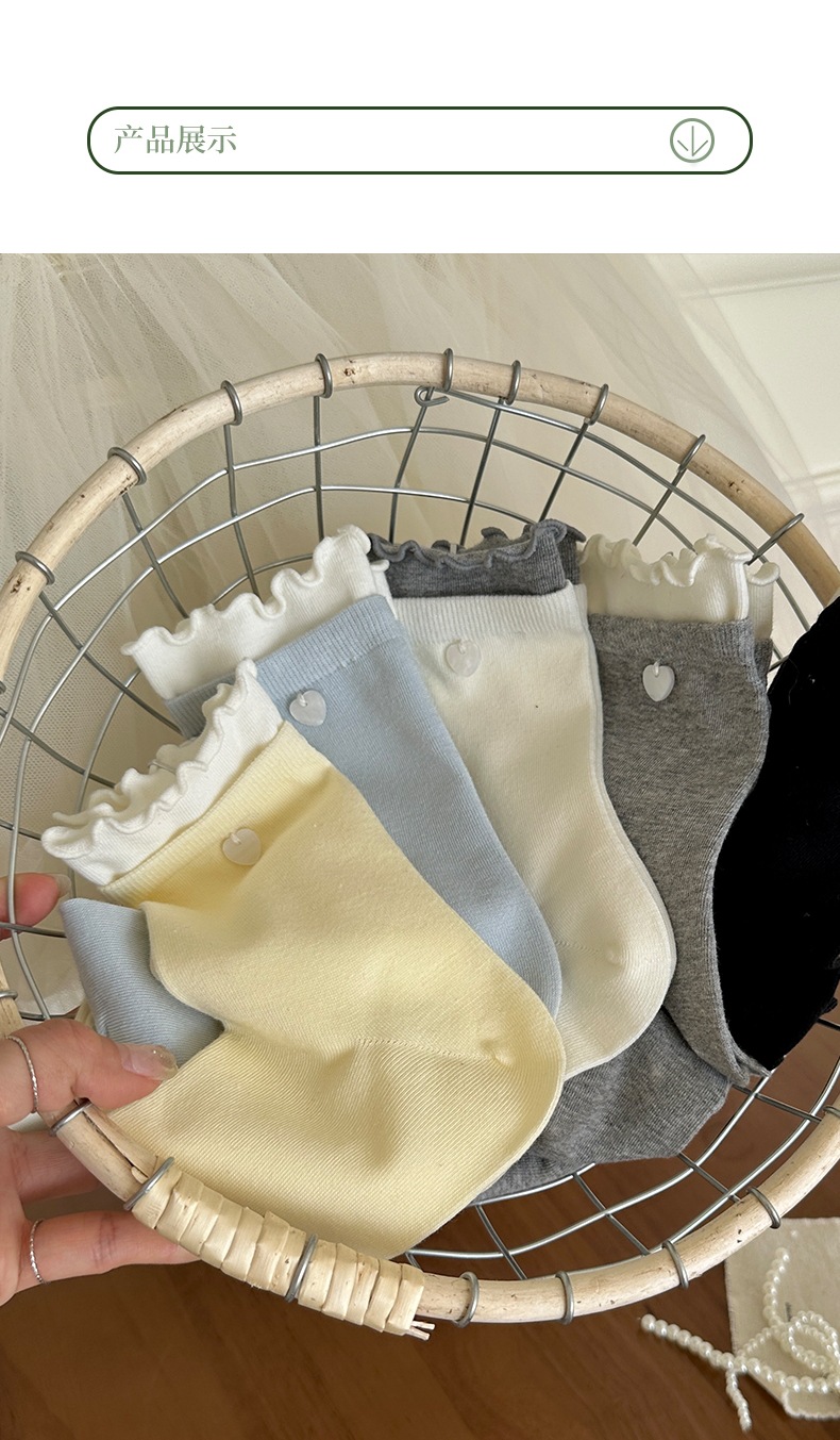 봄과 여름 사랑 버튼 귀 가장자리 명암 여성용 스택 양말 신선한 한국 스타일 Ins 스타일 더블 라쿠 미드 튜브 양말스토어 가기