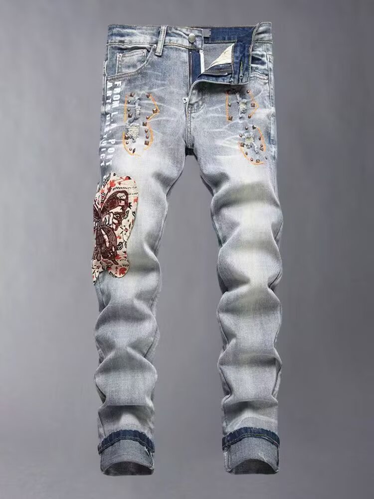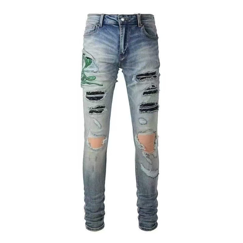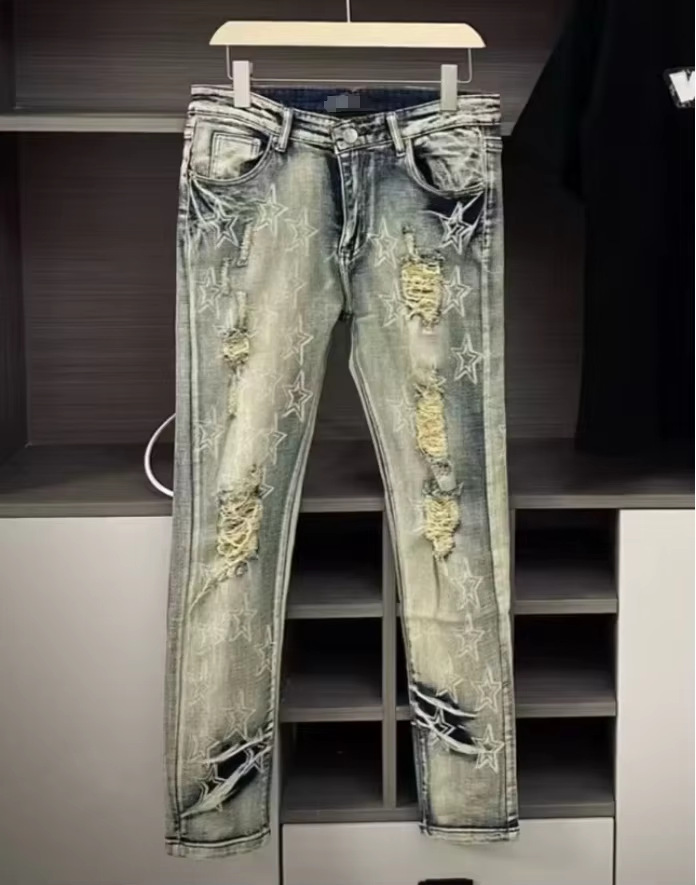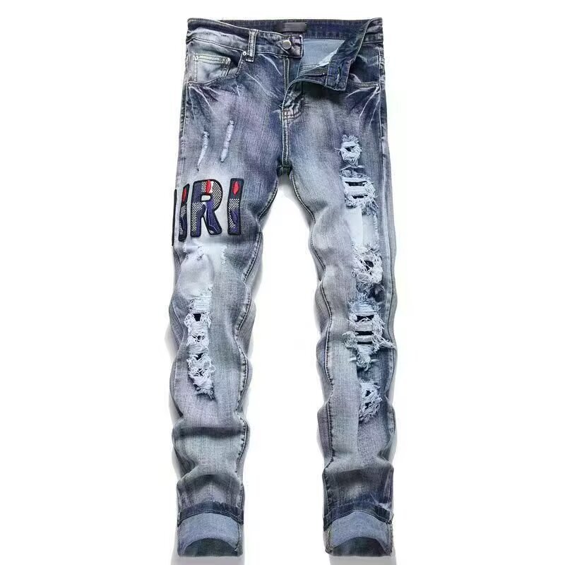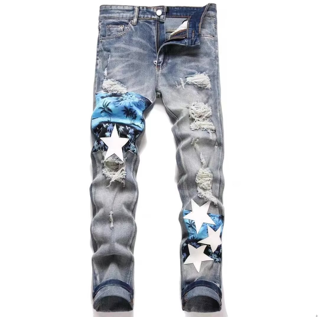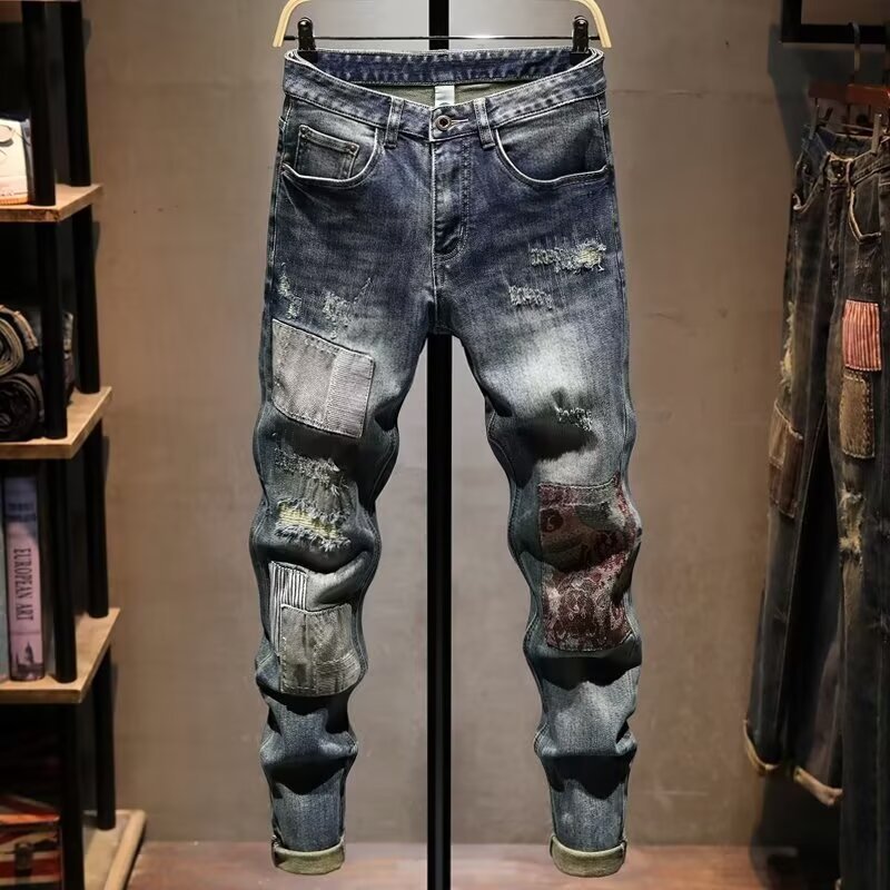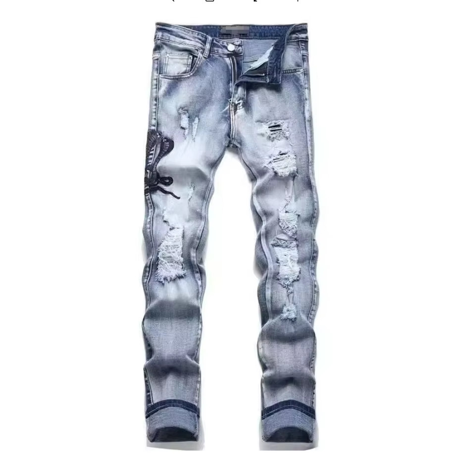트렌디 한 새로운 도착 찢어진 천 자수 청바지 남성 트렌디 한 캐주얼 패치 슬림 핏 작은 발 유행 맞춤형 바지스토어 가기