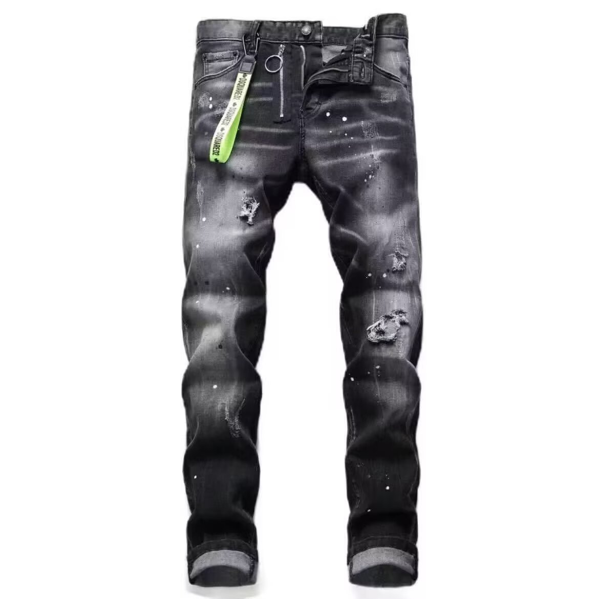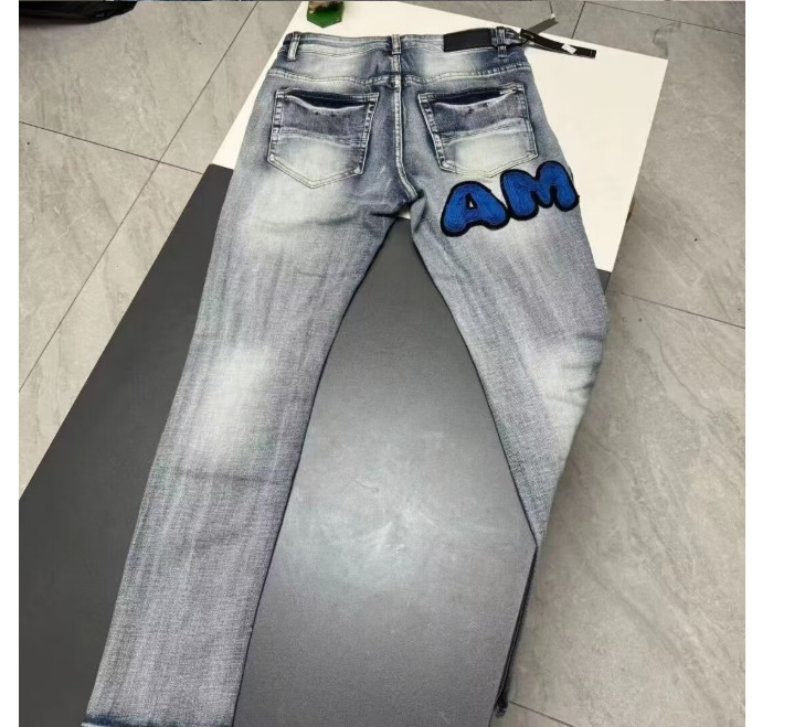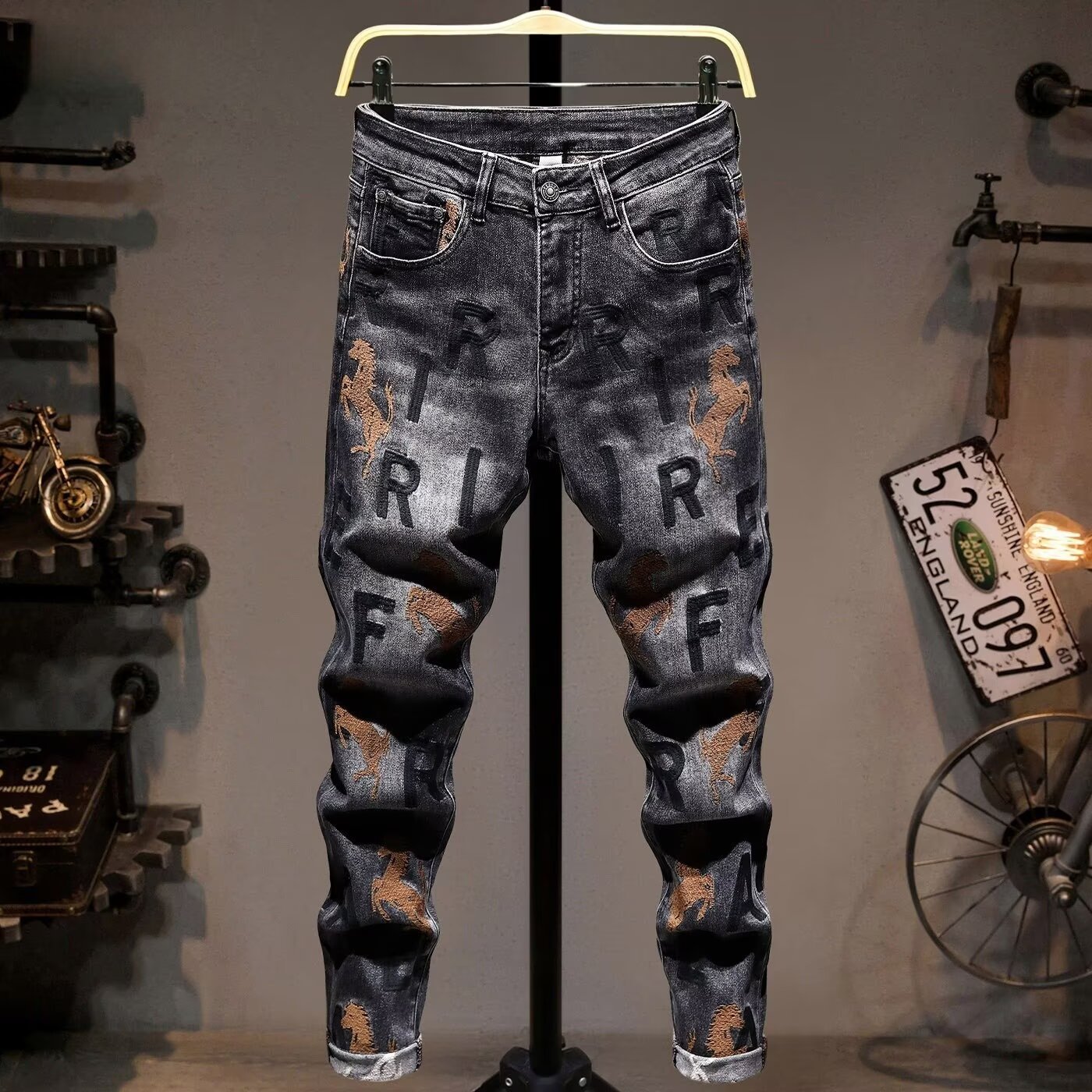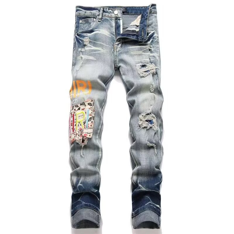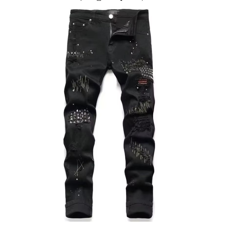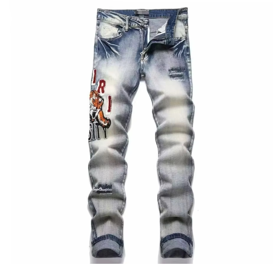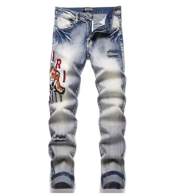트렌디 한 새로운 도착 찢어진 천 자수 청바지 남성 트렌디 한 캐주얼 패치 슬림 핏 작은 발 유행 맞춤형 바지스토어 가기