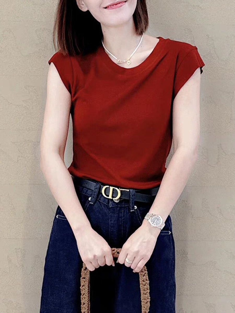 빨간 반팔 티셔츠 여성 2025 년 새 여름 독특한 아름다운 초크 허리 탑 어깨 뜨거운 소녀 비행 소매 작은 셔츠스토어 가기
