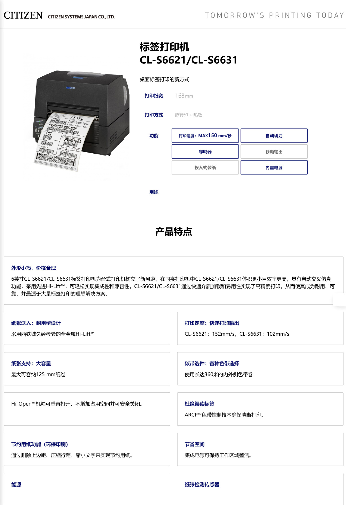 Citizen CL-S6621/S6631 데스크탑 라벨 프린터 6inch 와이드 프린터 물류 창고