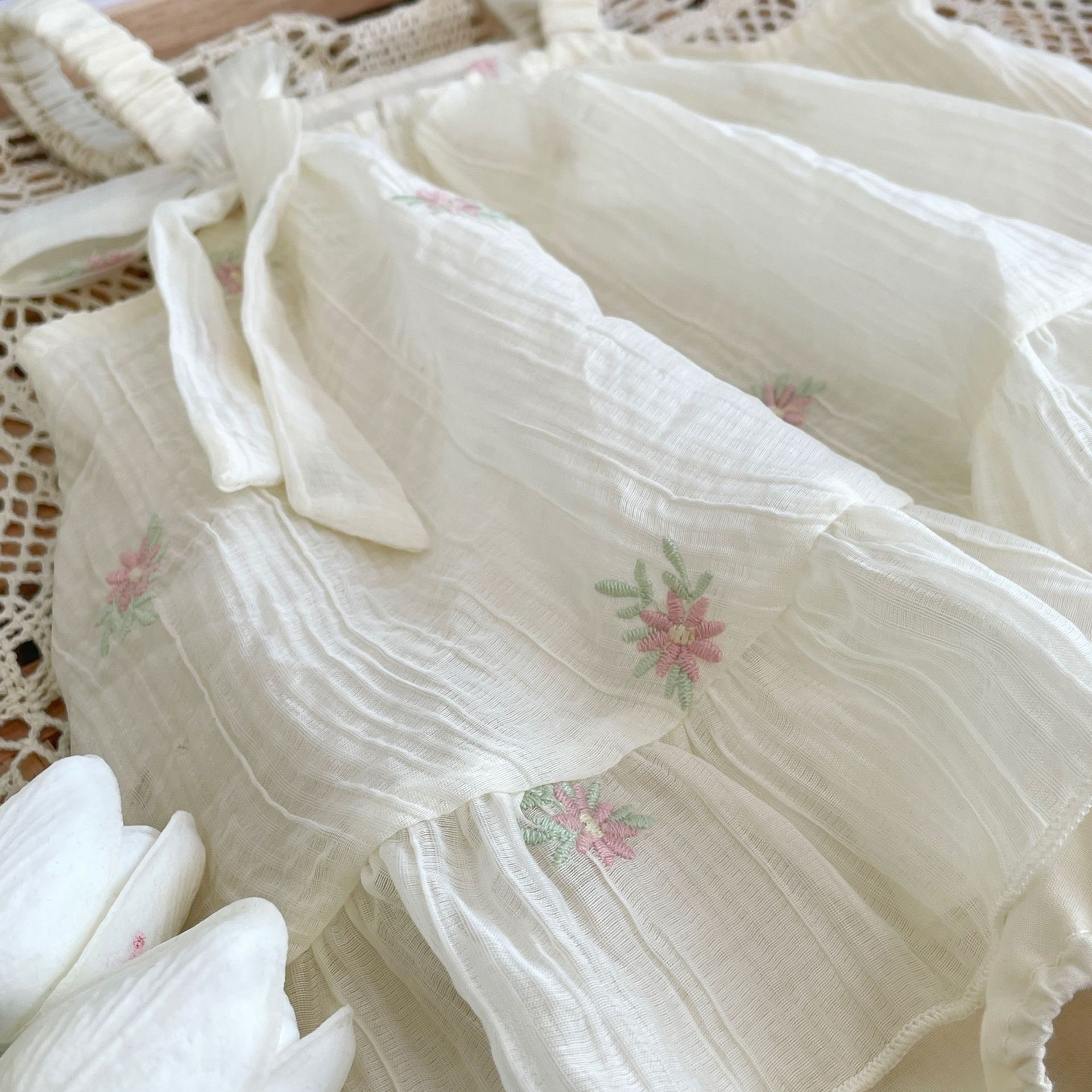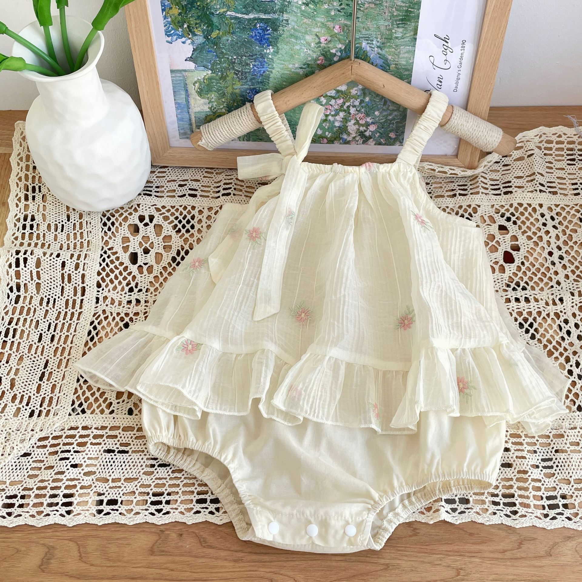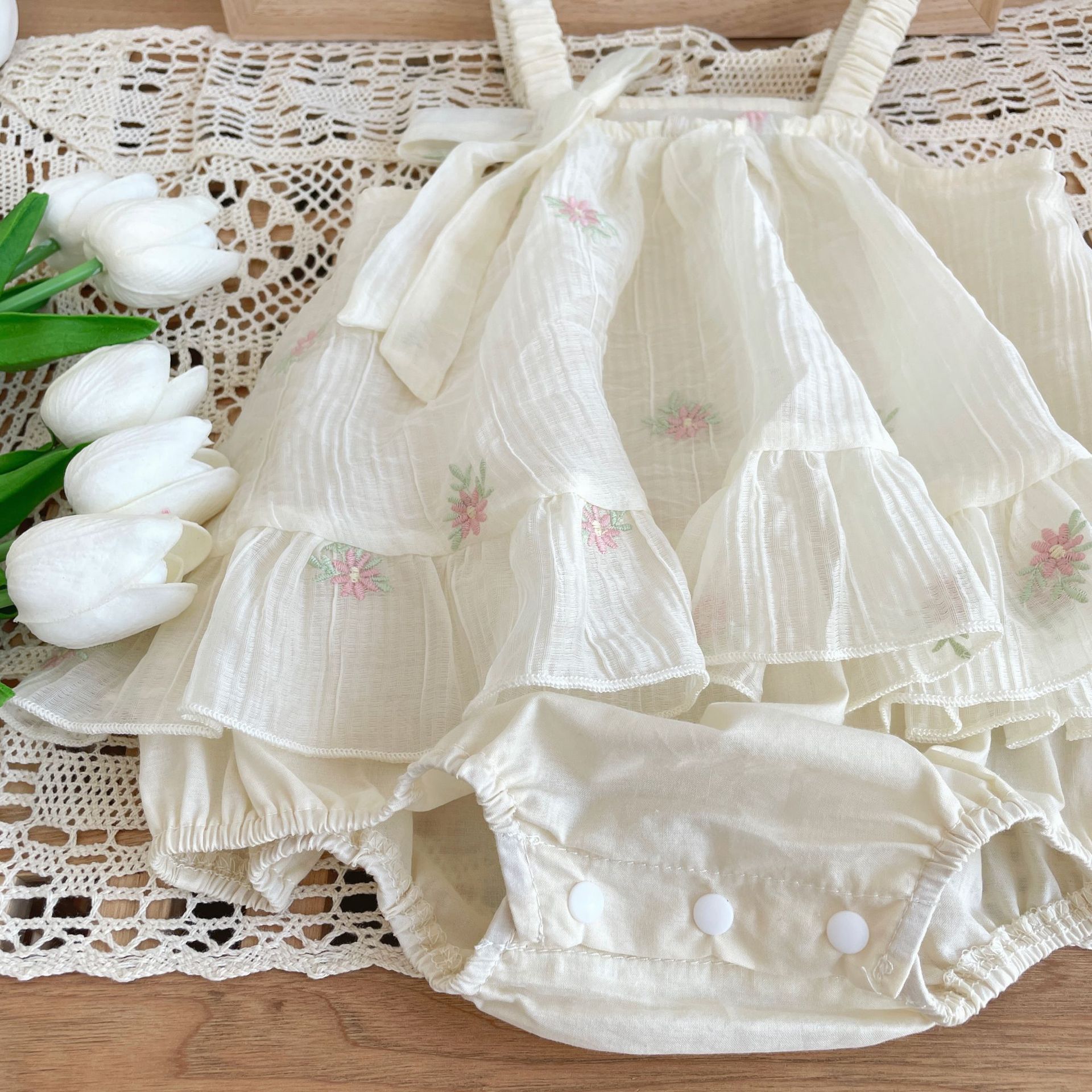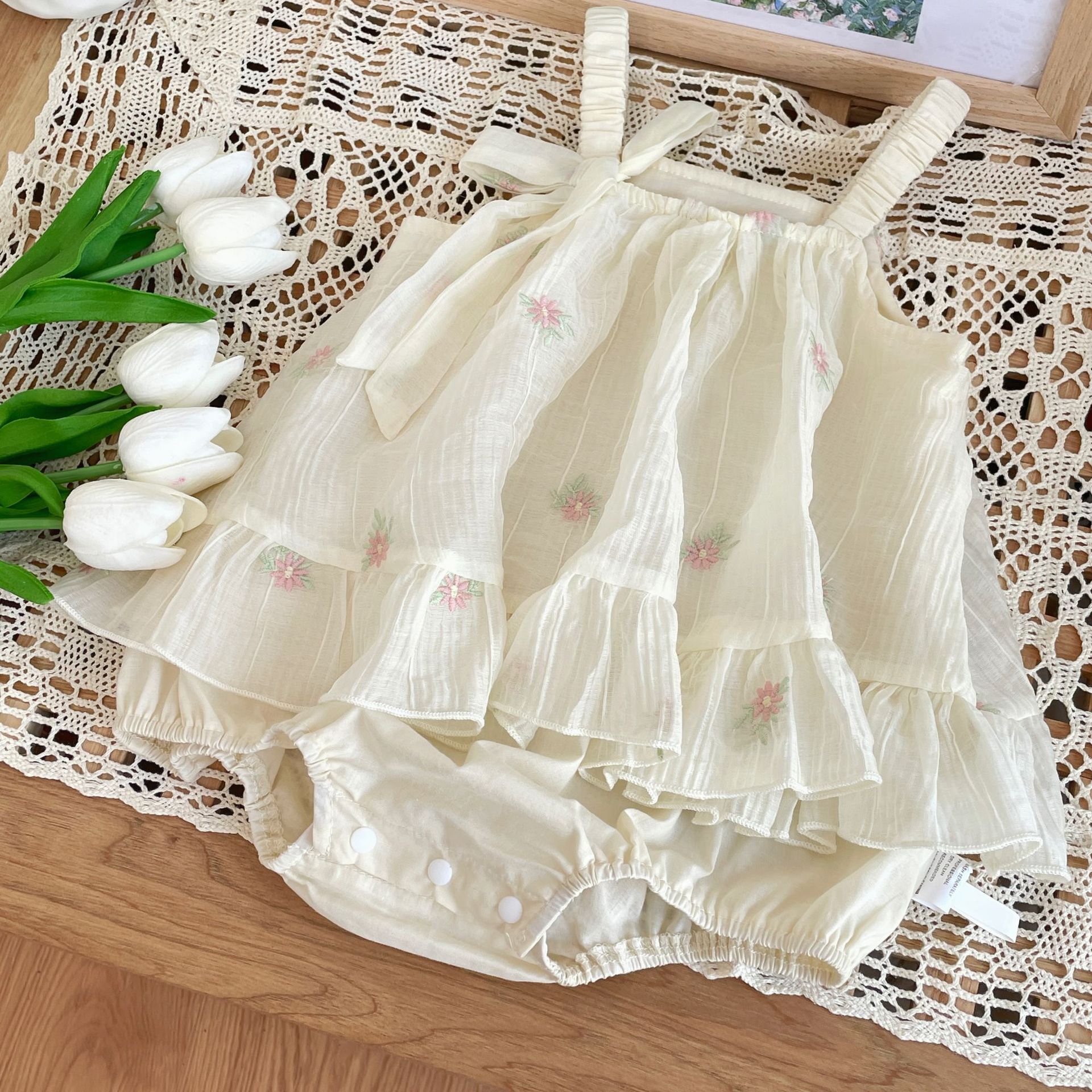 재고 여름 자수 아기 거즈 스커트 등반 의류 신생아 메쉬 랩 방귀 옷 클래스 A Ins 스타일 등반 의류스토어 가기
