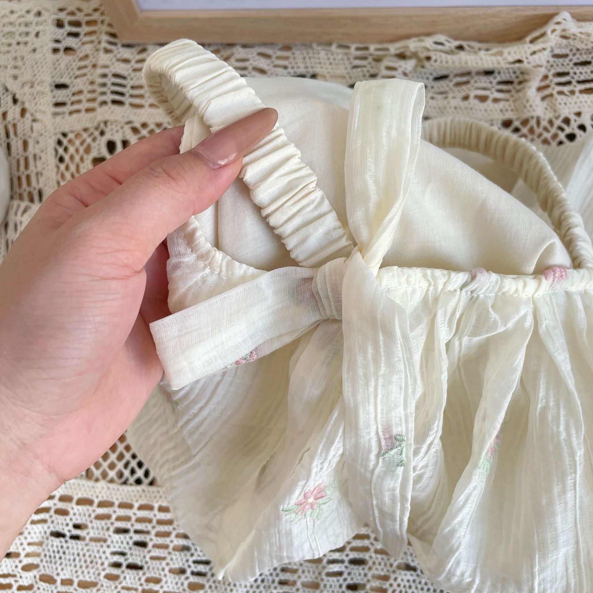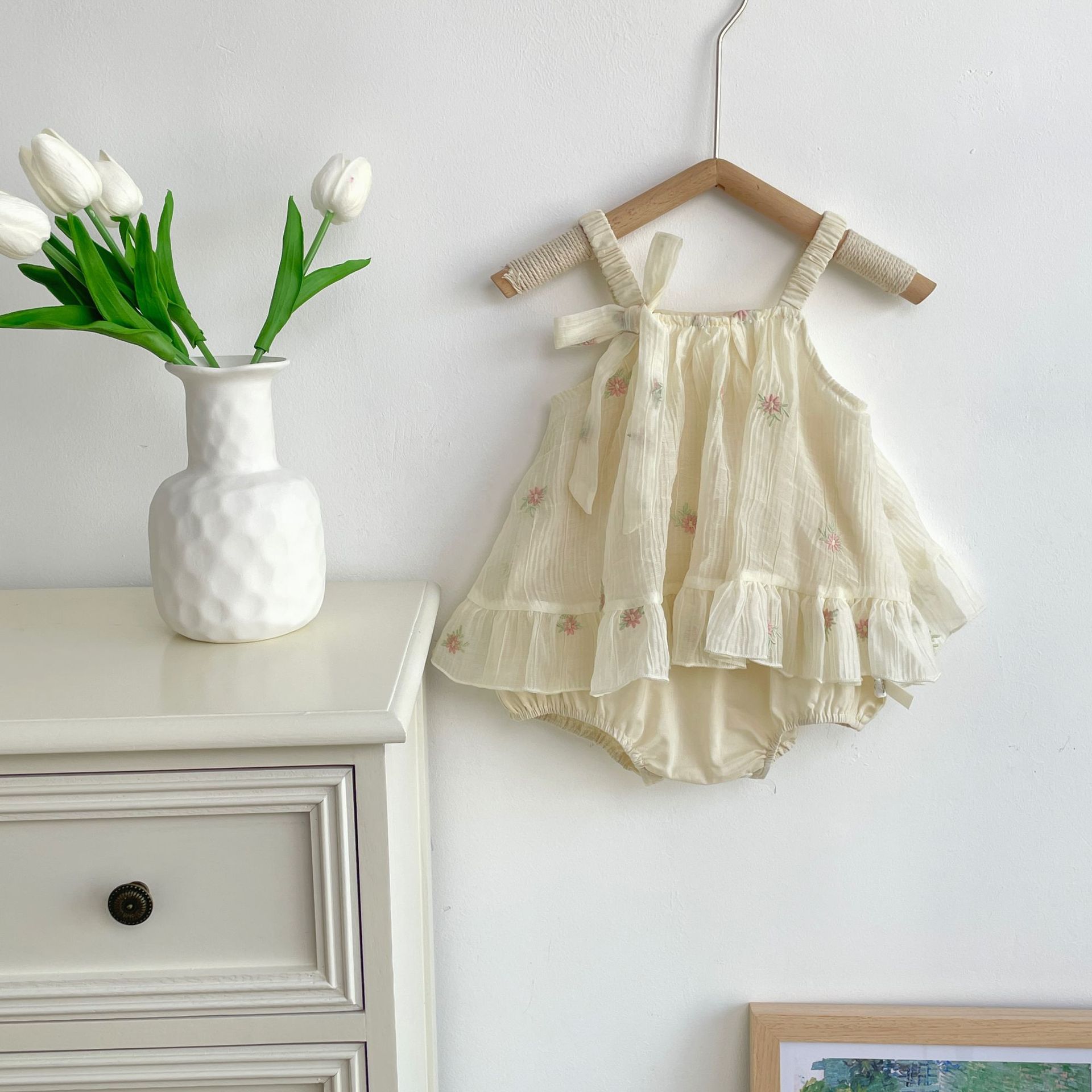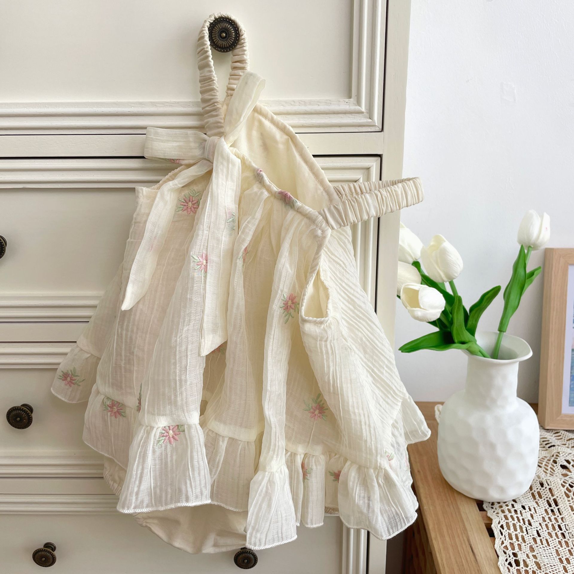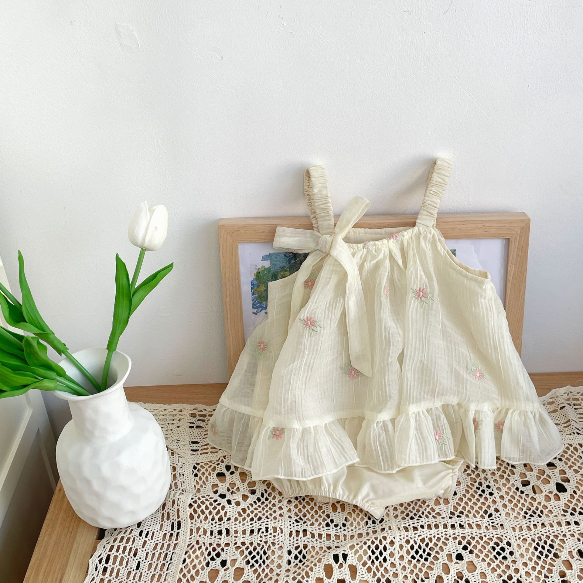 재고 여름 자수 아기 거즈 스커트 등반 의류 신생아 메쉬 랩 방귀 옷 클래스 A Ins 스타일 등반 의류스토어 가기
