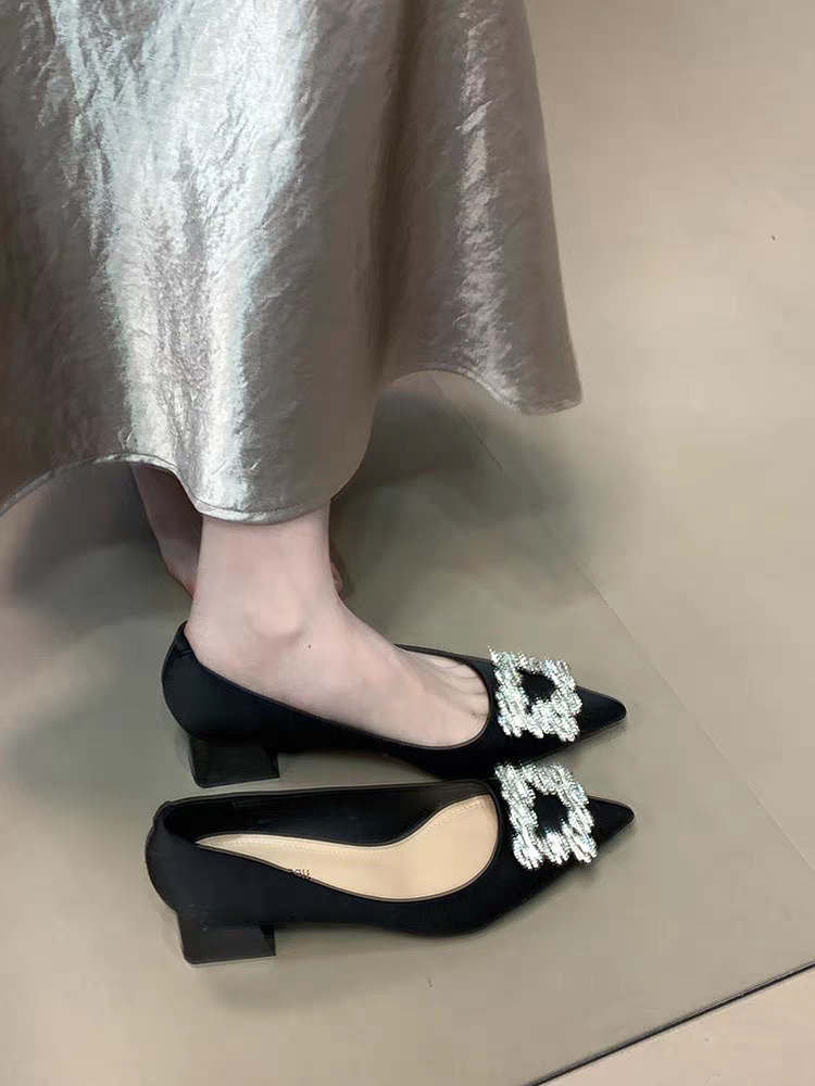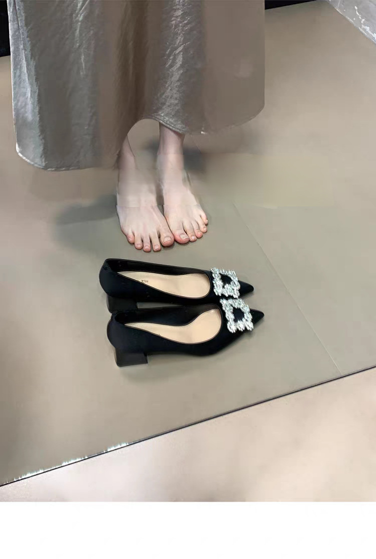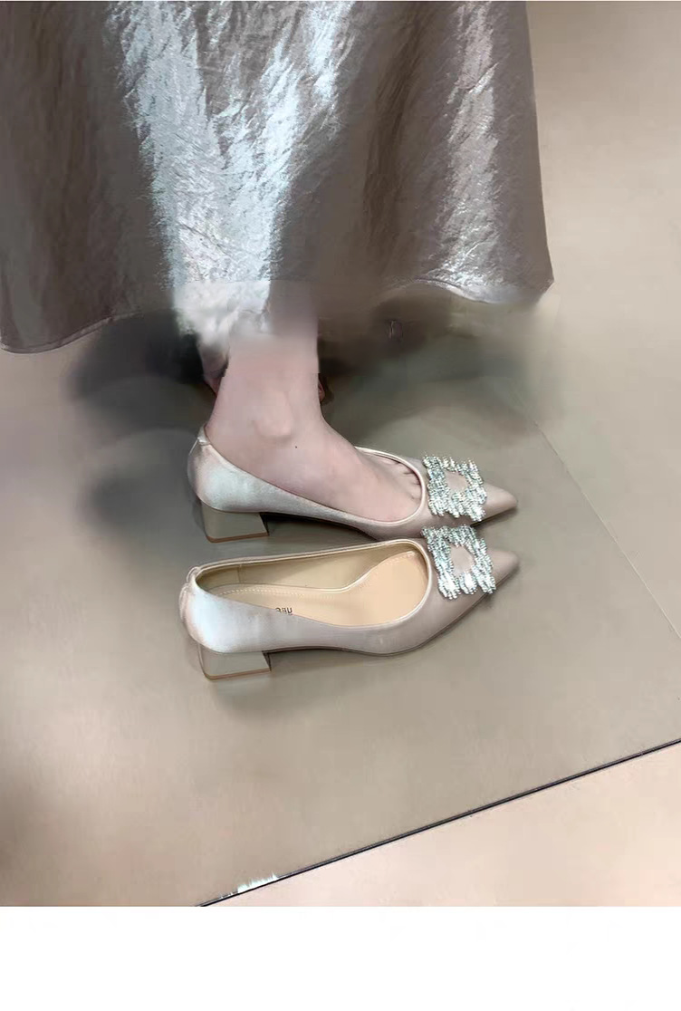 프랑스 요정 라인스톤 스퀘어 버클 두꺼운 힐 신발 여성의 2025 새로운 도착 새틴 포인팅 하이힐 신부 신발 웨딩 슈즈스토어 가기