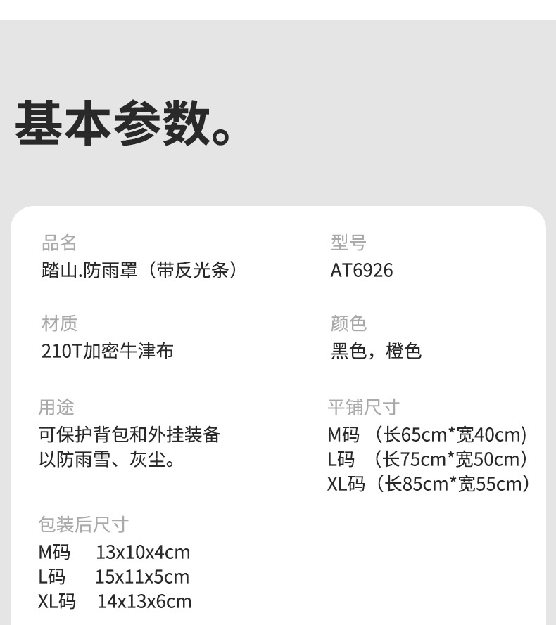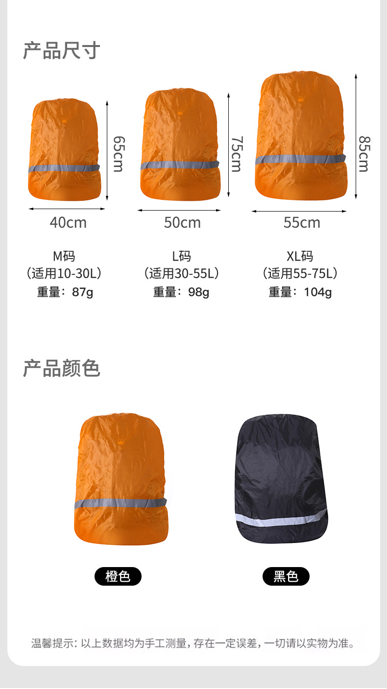 适用背包:M码(适用10-30L);L码(适用30-55L);XL码(适用55-75L)