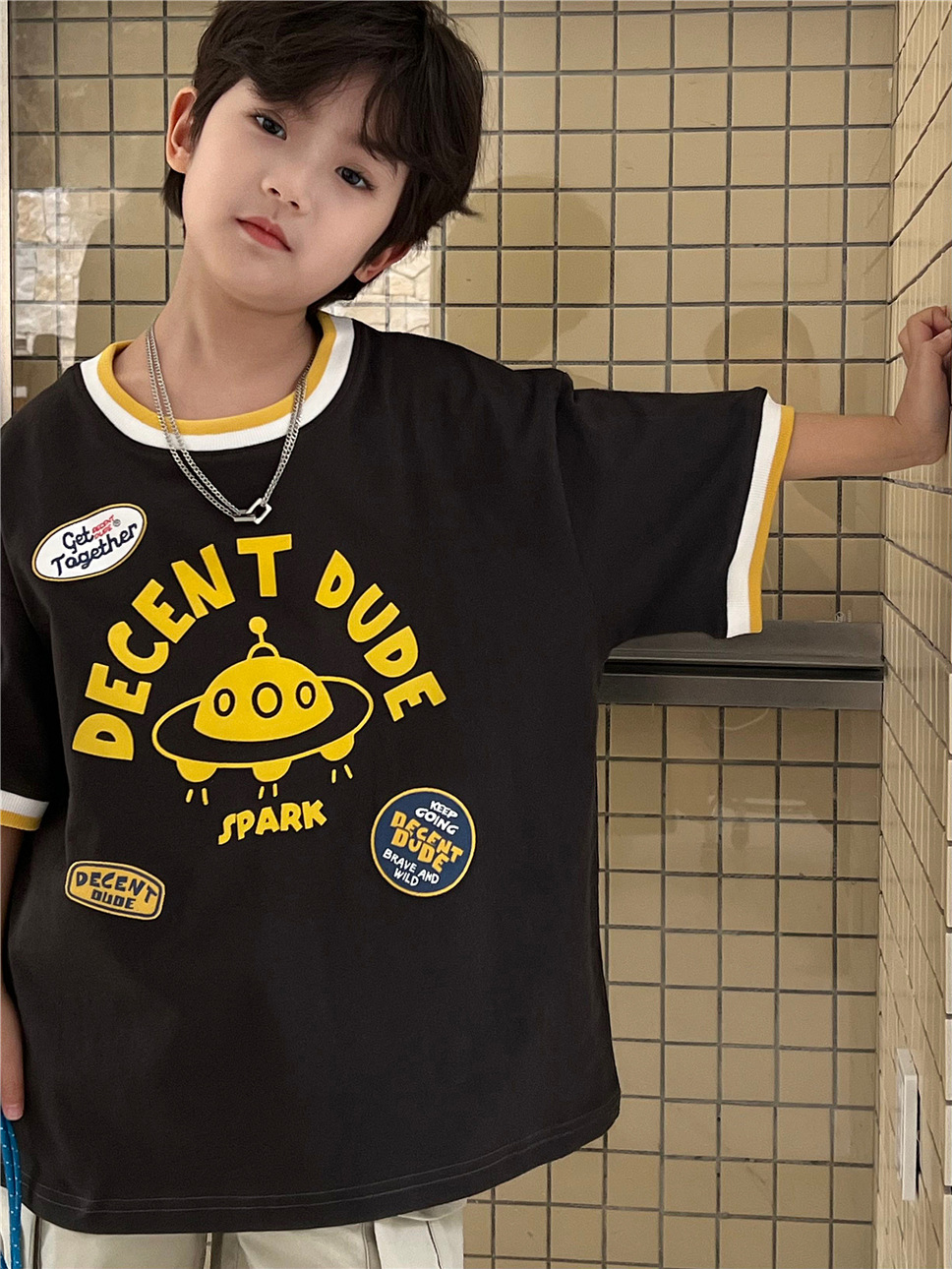 여름 2025 어린이 반팔 다채로운 스레드 UFO 스테레오 범프 인쇄 유행 반팔 티셔츠 소년 소녀스토어 가기