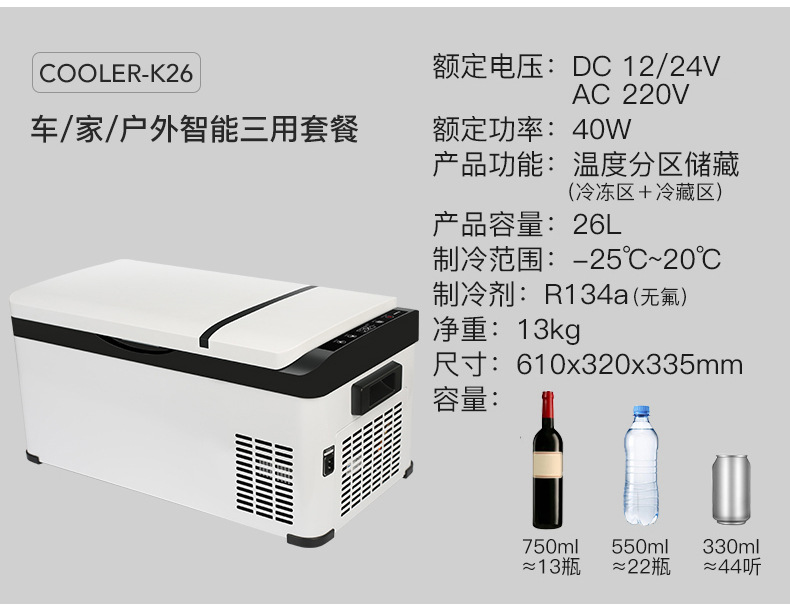 • 26리터 - 냉동 및 냉장 이중 구역 [K26 체지아 겸용 터치 컨트롤] 12/24/220V