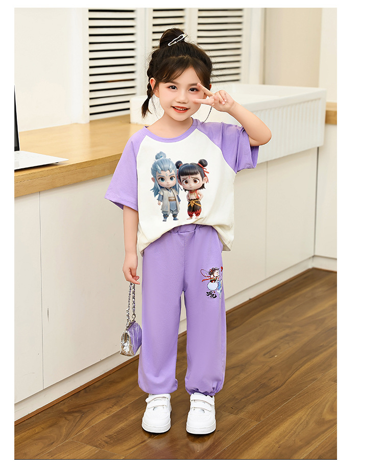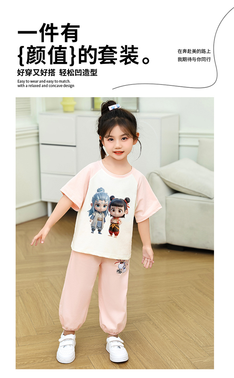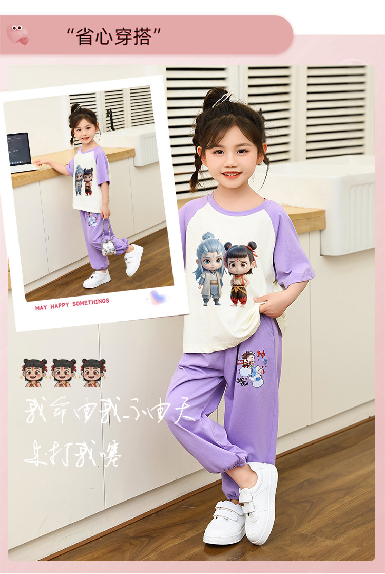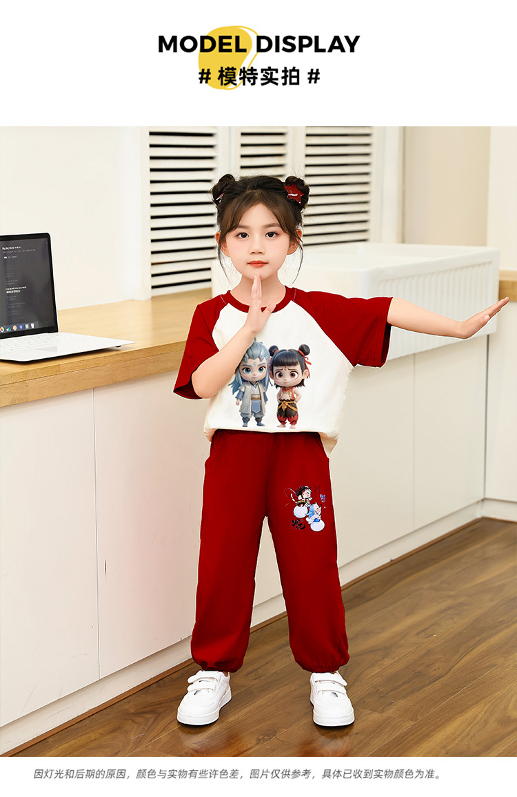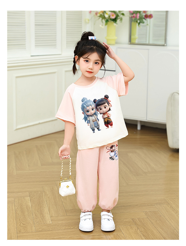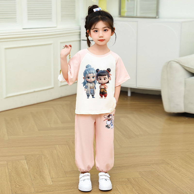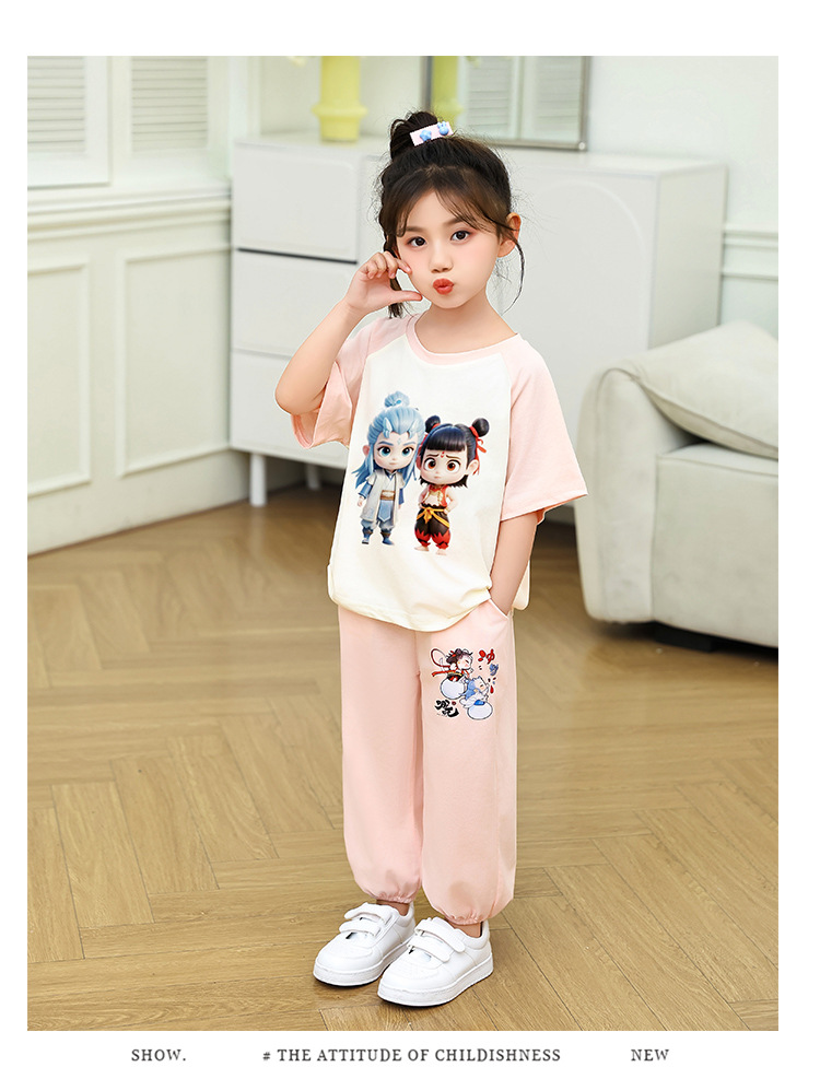 2025 어린이 여름 캐주얼 컬러 매칭 소녀 2025 새로운 스타일 Nezha Ao Bing 인터넷 인기 반팔 바지 패션 세트스토어 가기