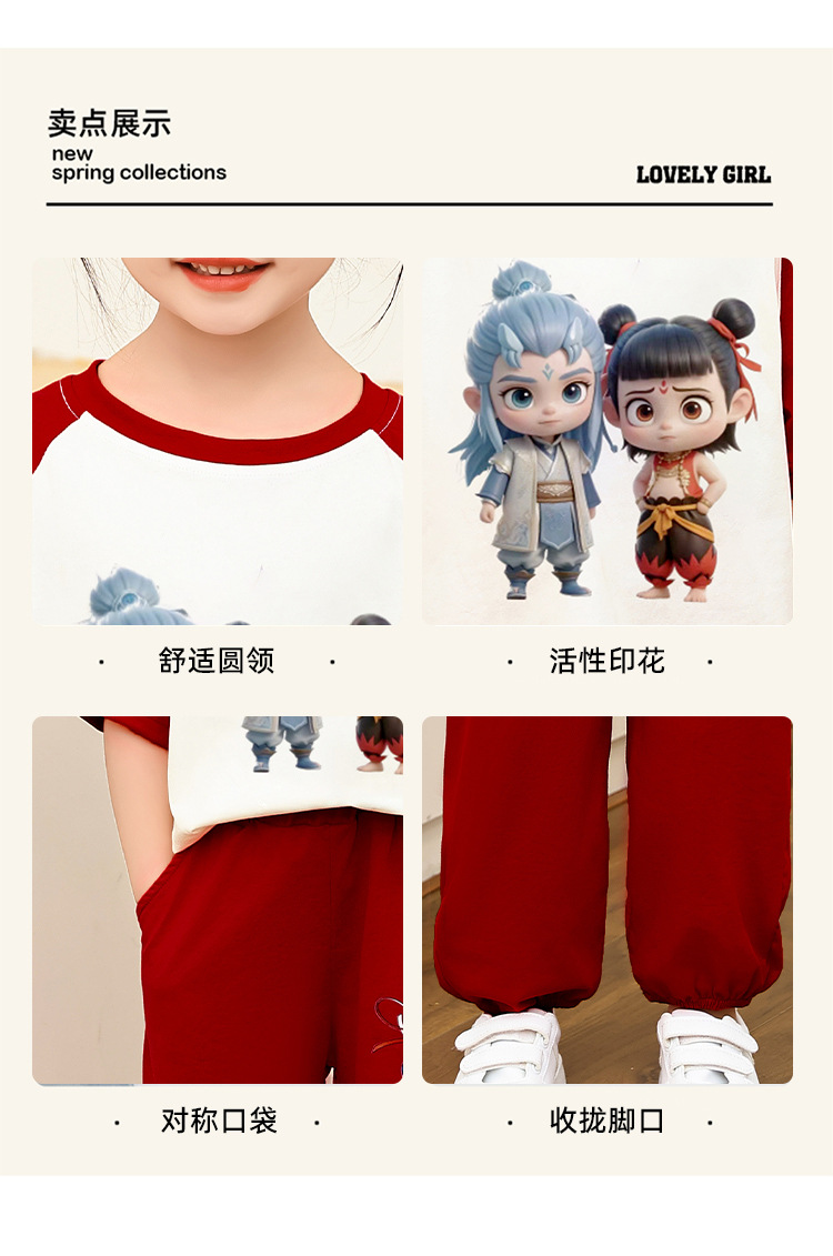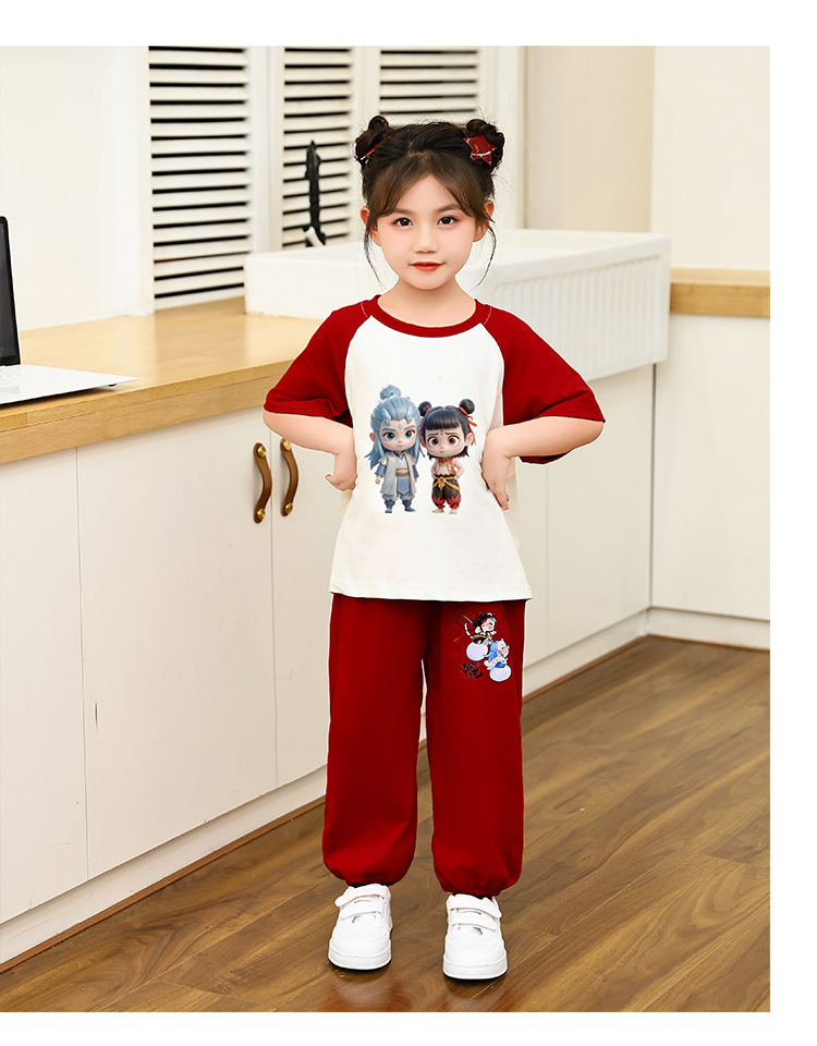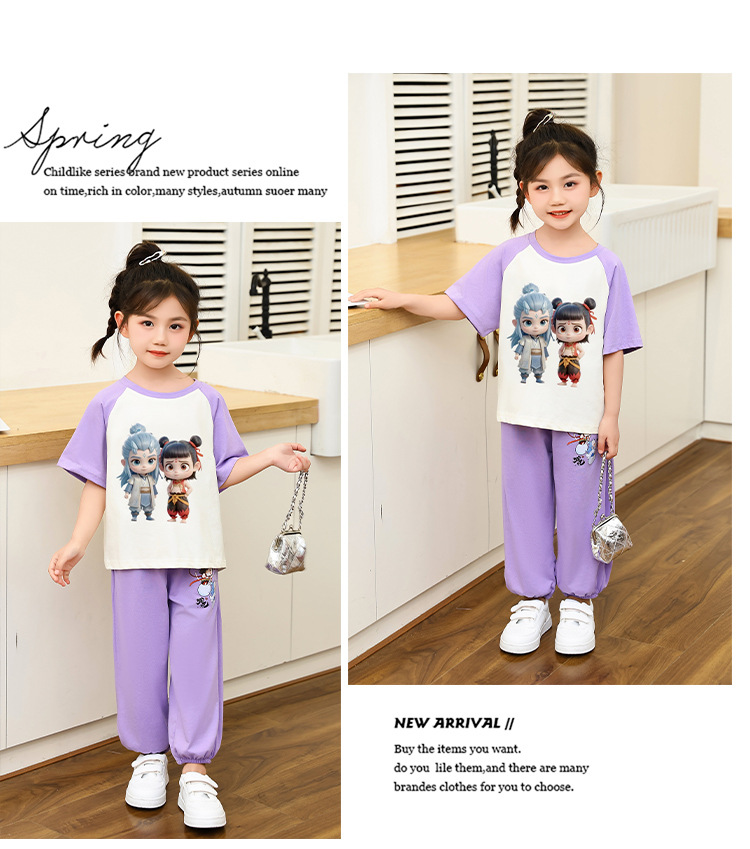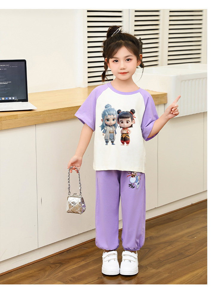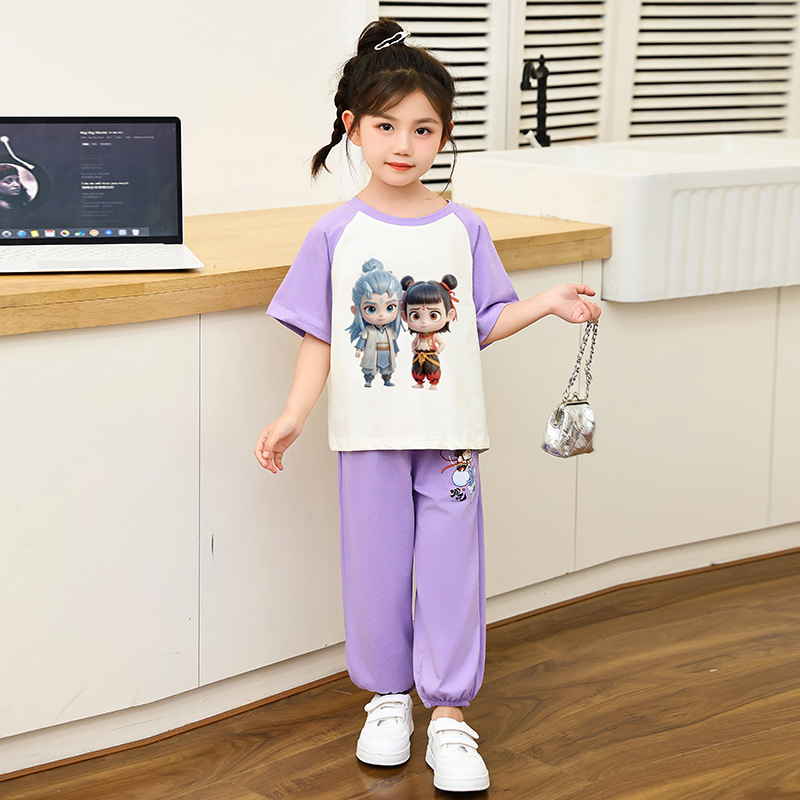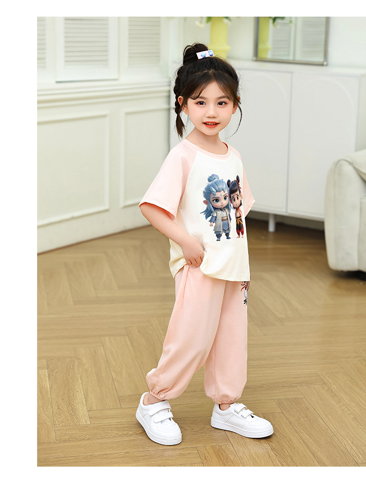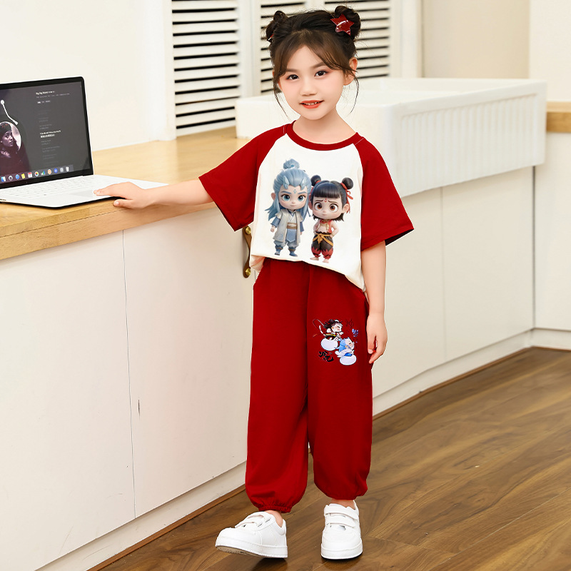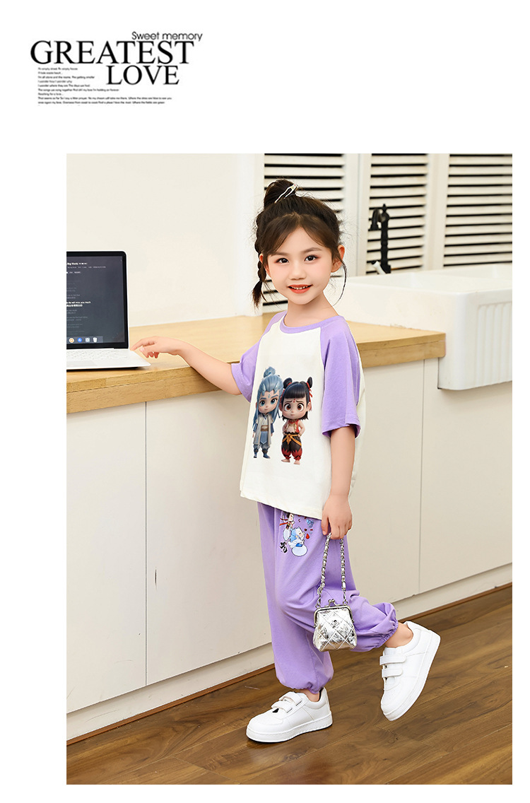 2025 어린이 여름 캐주얼 컬러 매칭 소녀 2025 새로운 스타일 Nezha Ao Bing 인터넷 인기 반팔 바지 패션 세트스토어 가기