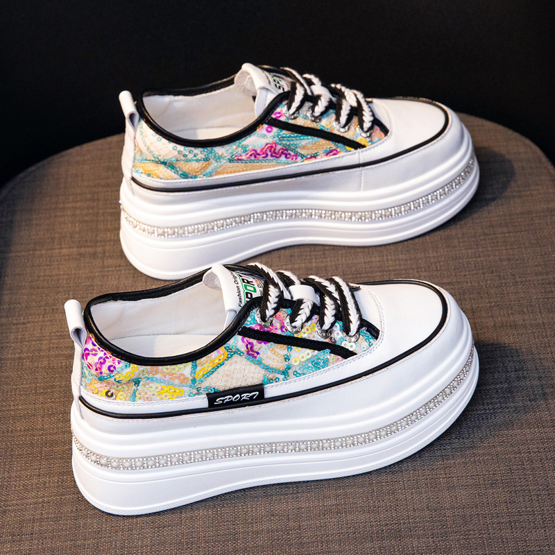 Sequin White 신발 여성의 2025 새로운 두꺼운 단일 높이 8cm 보드 신발 작은 치마 캐주얼 라인스톤 트렌디 신발