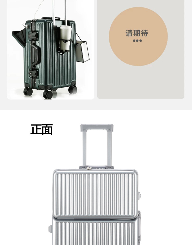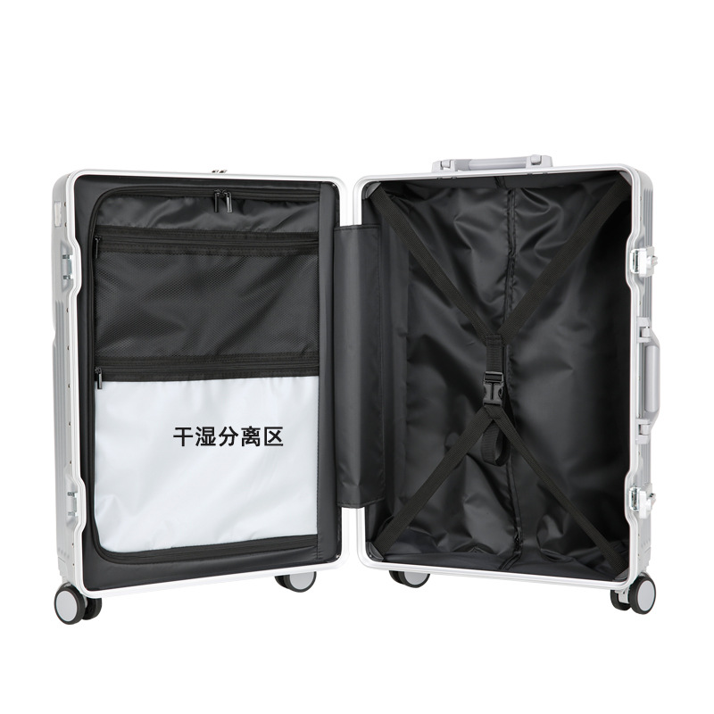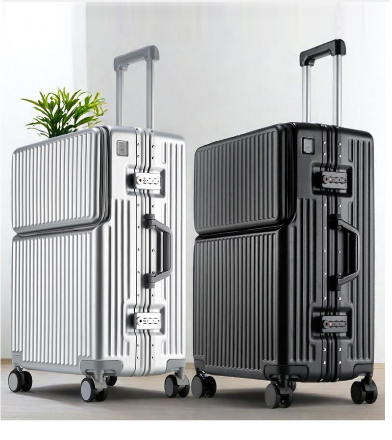 전면 개방 알루미늄 프레임 비즈니스 수하물 남자의 조용한 유니버설 휠 가방 여성 다기능 암호 상자
