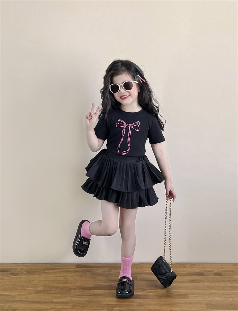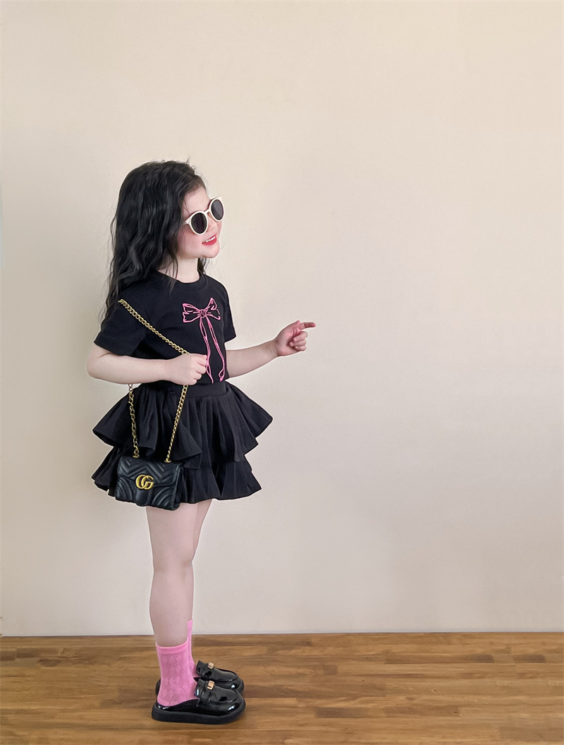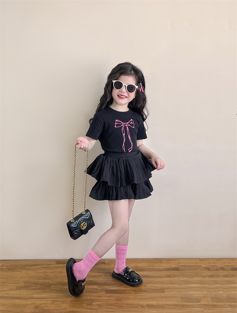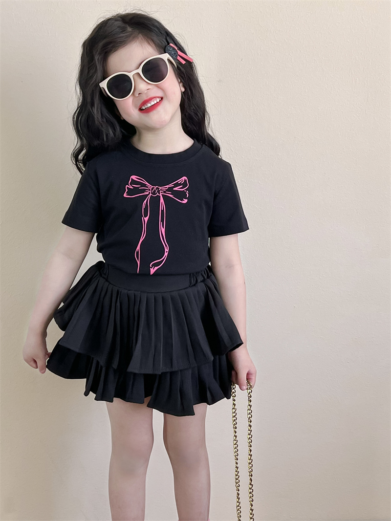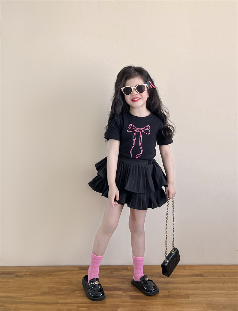 소녀 여름 달콤한 블랙 반팔 활 티셔츠 블랙 하이 허리 퍼프 케이크 스커트 트렌디 스커트